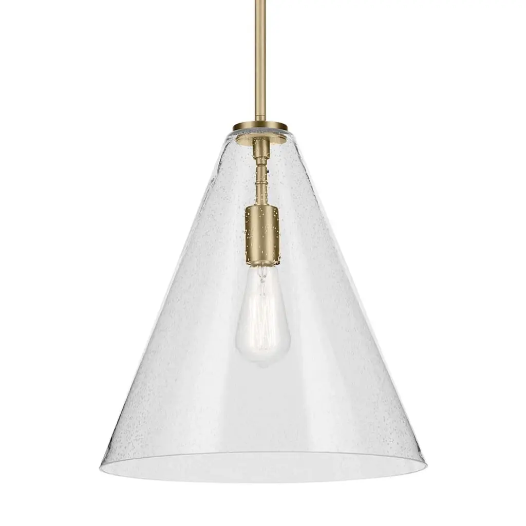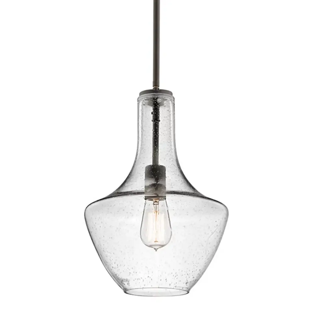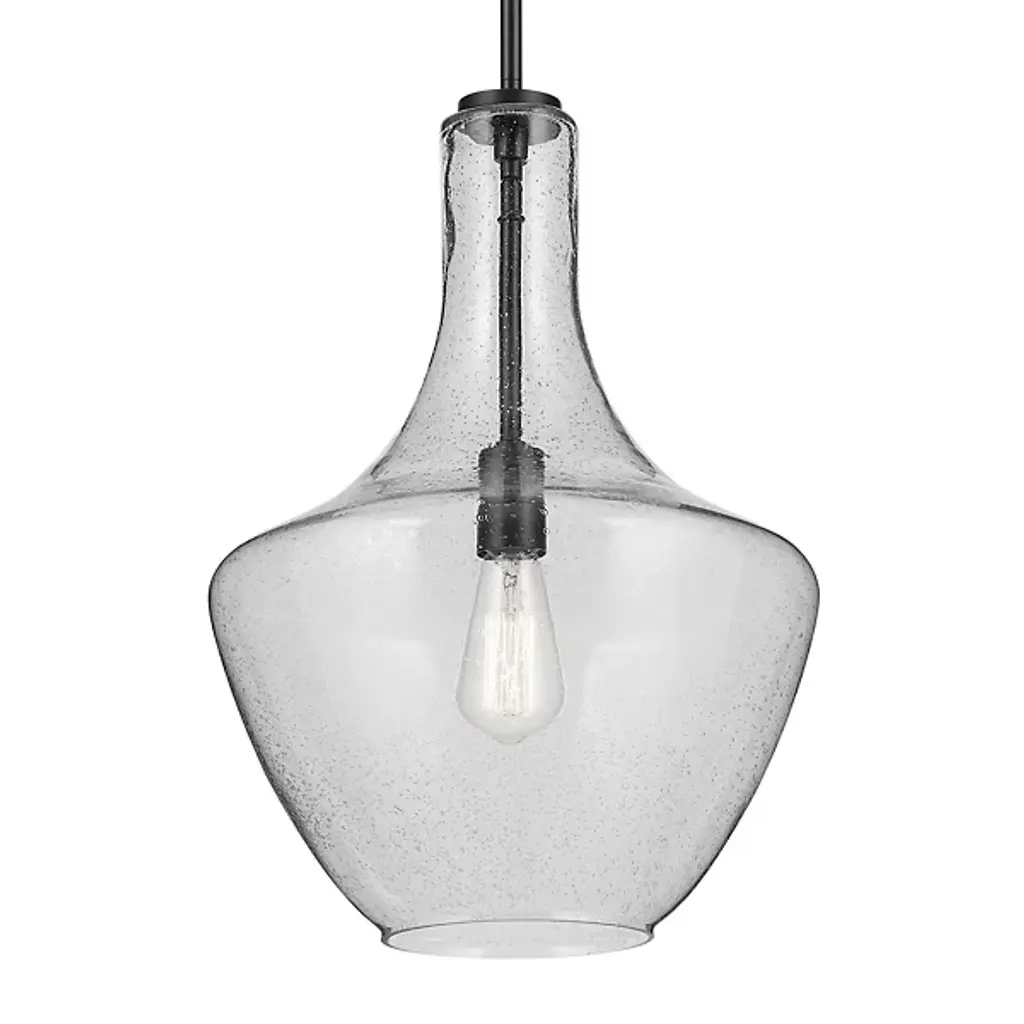 Blown decorative glass containers inspired the design of the highly decorative Kichler Everly Pendant. The wide curves of the Clear glass shade evoke the shape of a classic table lamp and provide a pleasingly soft outline around the exposed bulb within. For warm, vintage twinkle, use with a classic Edison incandescent bulb.