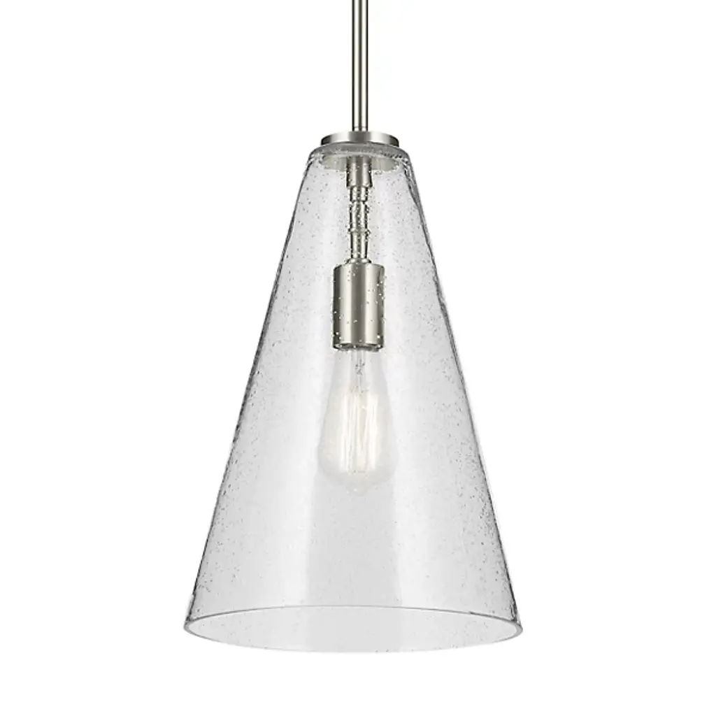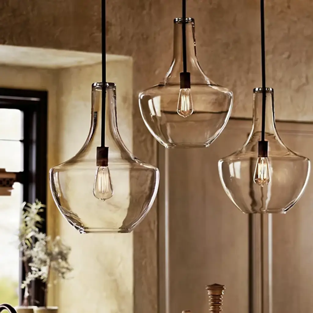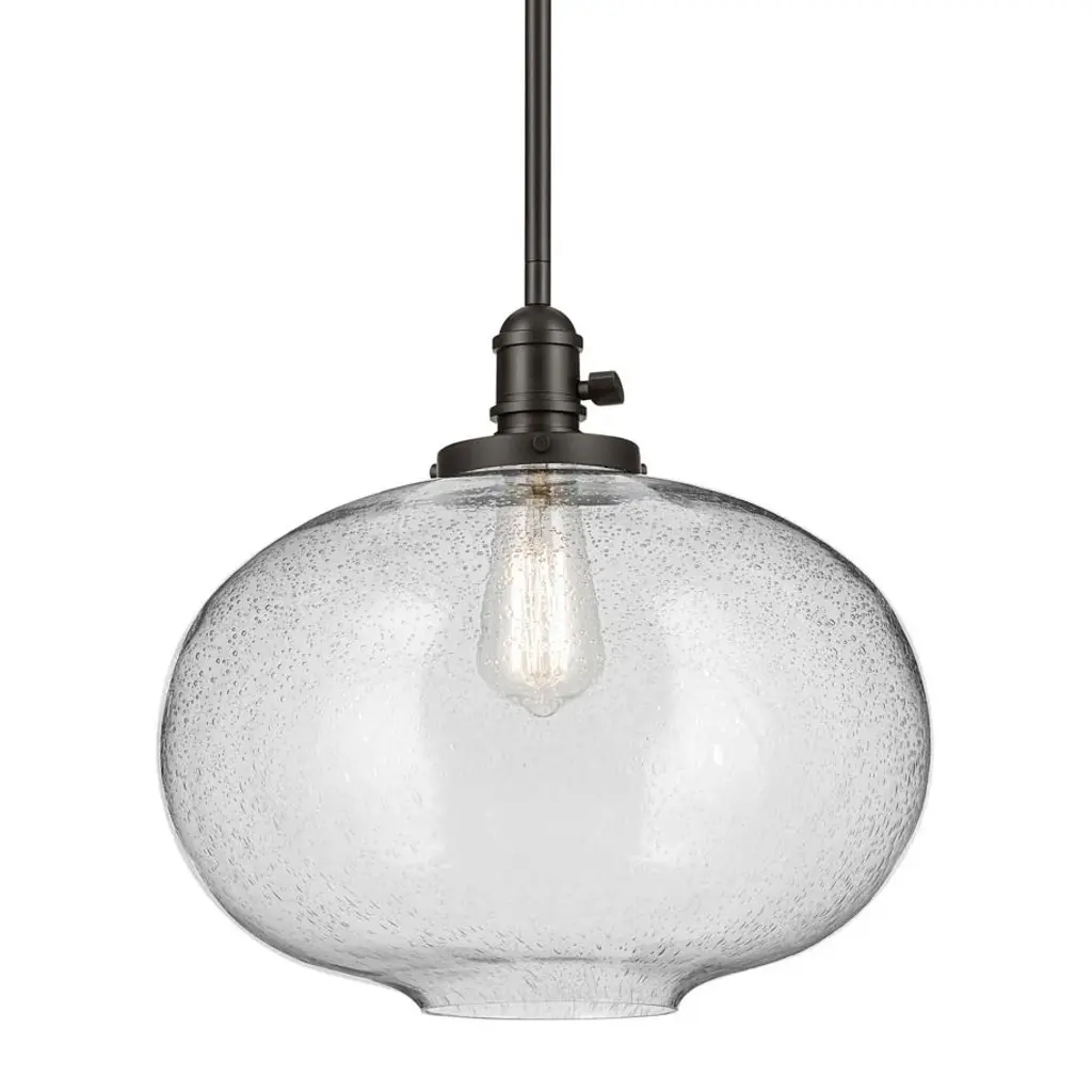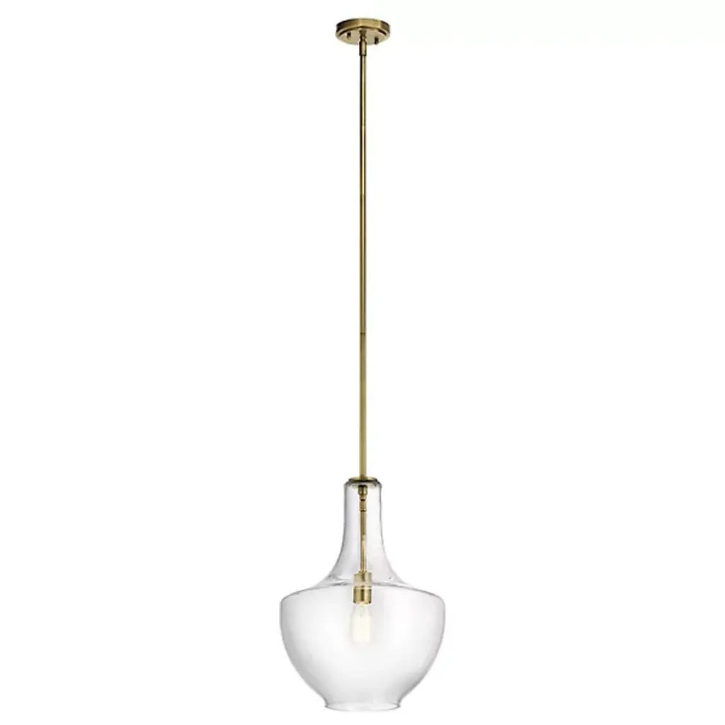 Blown decorative glass containers inspired the design of the highly decorative Kichler Everly Pendant. The wide curves of the Clear glass shade evoke the shape of a classic table lamp and provide a pleasingly soft outline around the exposed bulb within. For warm, vintage twinkle, use with a classic Edison incandescent bulb.