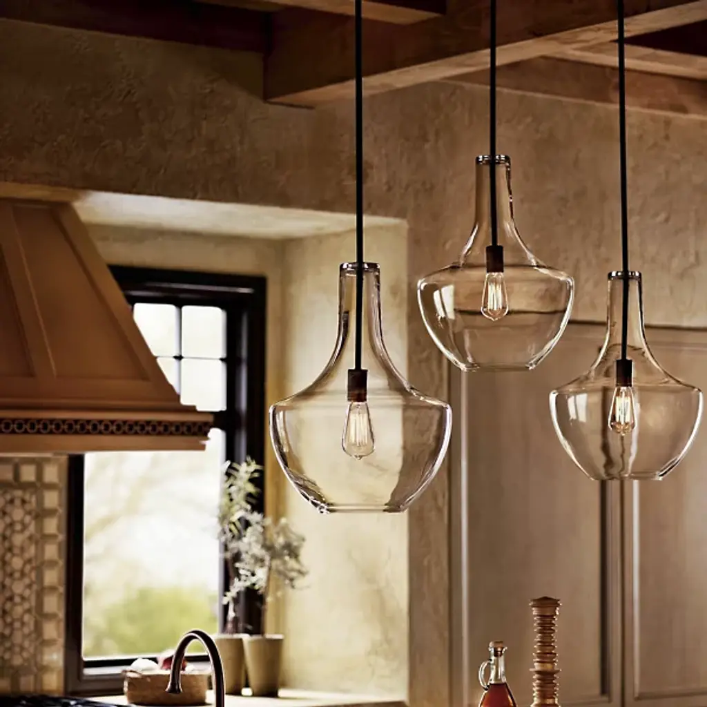 Blown decorative glass containers inspired the design of the highly decorative Kichler Everly Pendant. The wide curves of the Clear glass shade evoke the shape of a classic table lamp and provide a pleasingly soft outline around the exposed bulb within. For warm, vintage twinkle, use with a classic Edison incandescent bulb.
