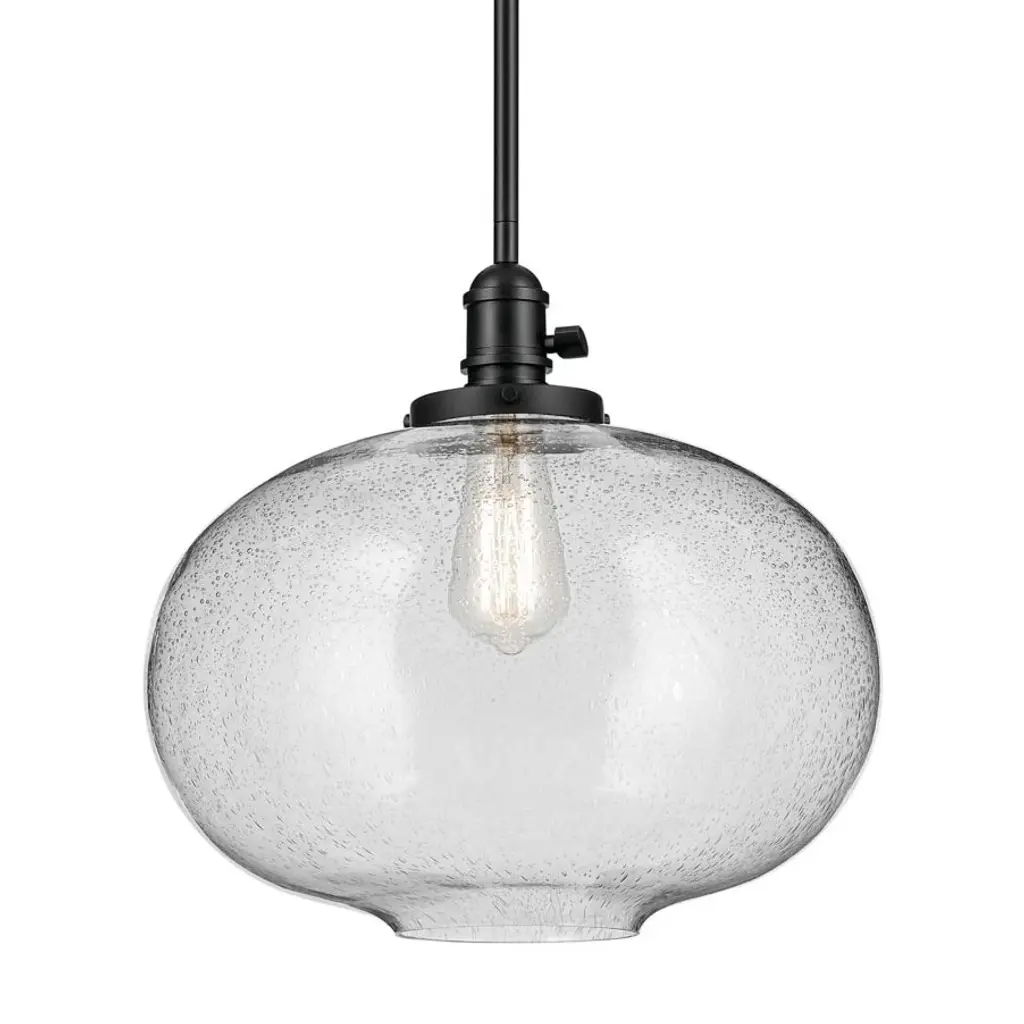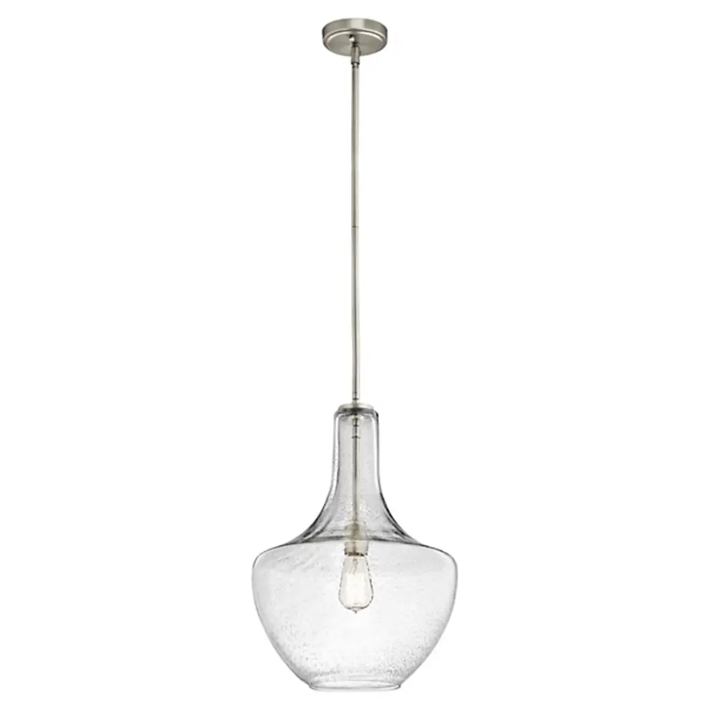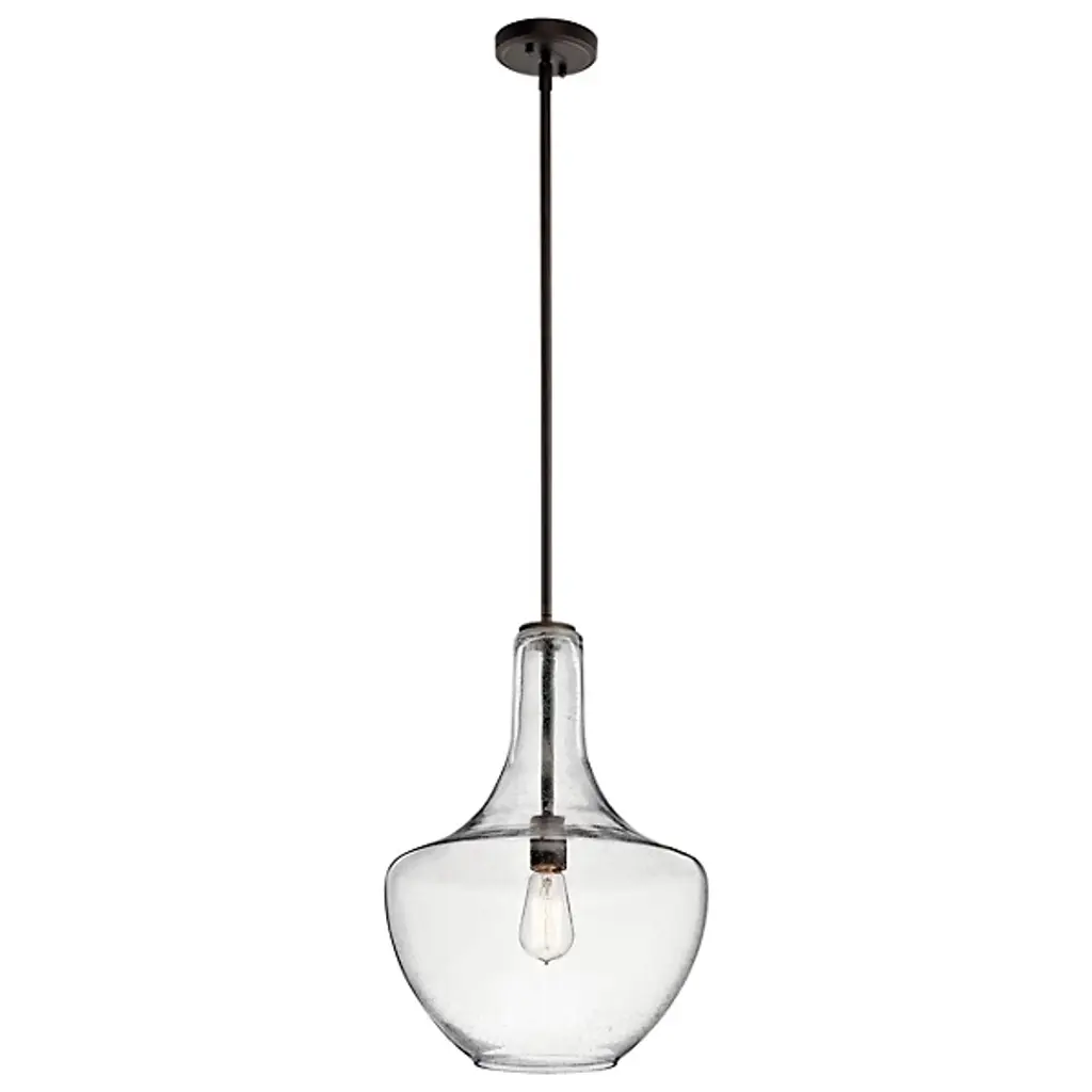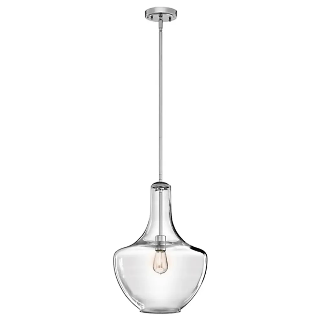 Blown decorative glass containers inspired the design of the highly decorative Kichler Everly Pendant. The wide curves of the Clear glass shade evoke the shape of a classic table lamp and provide a pleasingly soft outline around the exposed bulb within. For warm, vintage twinkle, use with a classic Edison incandescent bulb.