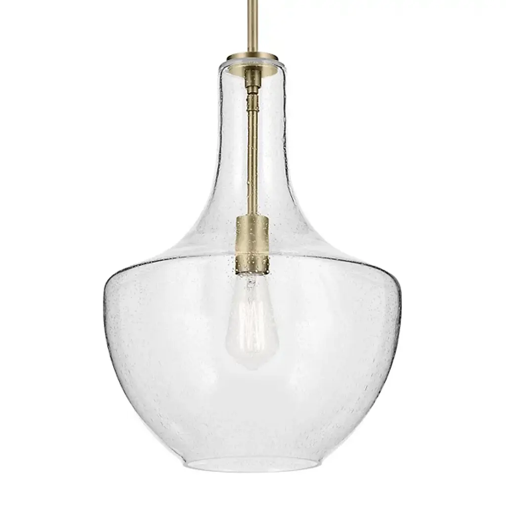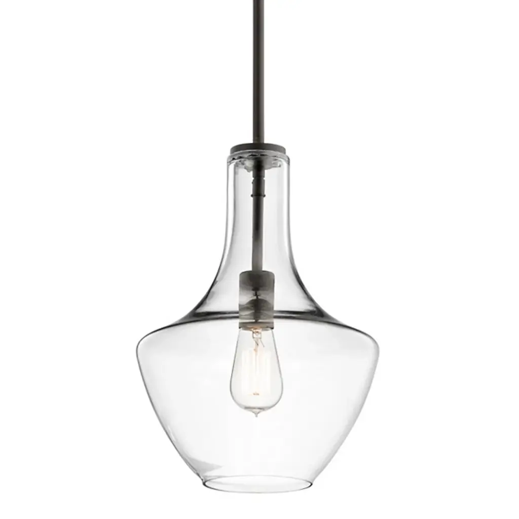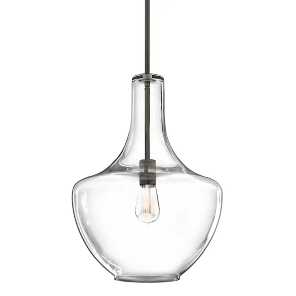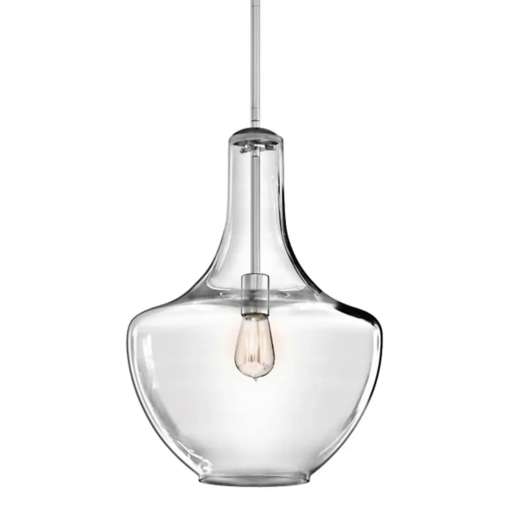 Blown decorative glass containers inspired the design of the highly decorative Kichler Everly Pendant. The wide curves of the Clear glass shade evoke the shape of a classic table lamp and provide a pleasingly soft outline around the exposed bulb within. For warm, vintage twinkle, use with a classic Edison incandescent bulb.