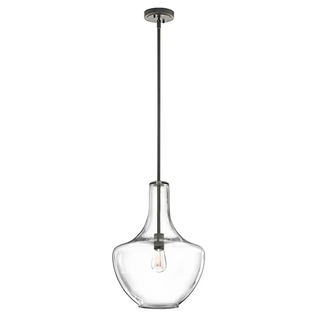 Blown decorative glass containers inspired the design of the highly decorative Kichler Everly Pendant. The wide curves of the Clear glass shade evoke the shape of a classic table lamp and provide a pleasingly soft outline around the exposed bulb within. For warm, vintage twinkle, use with a classic Edison incandescent bulb.
