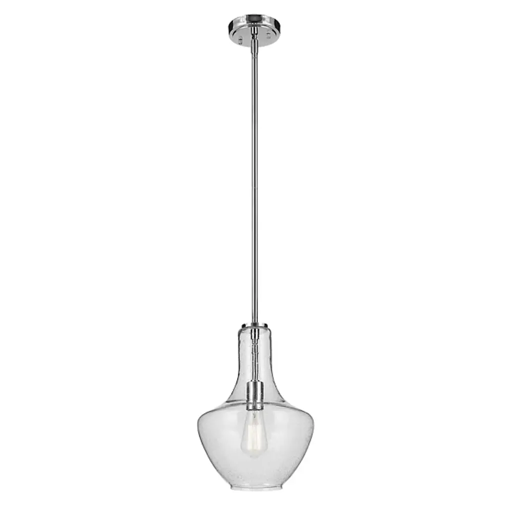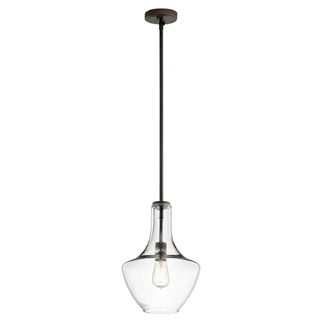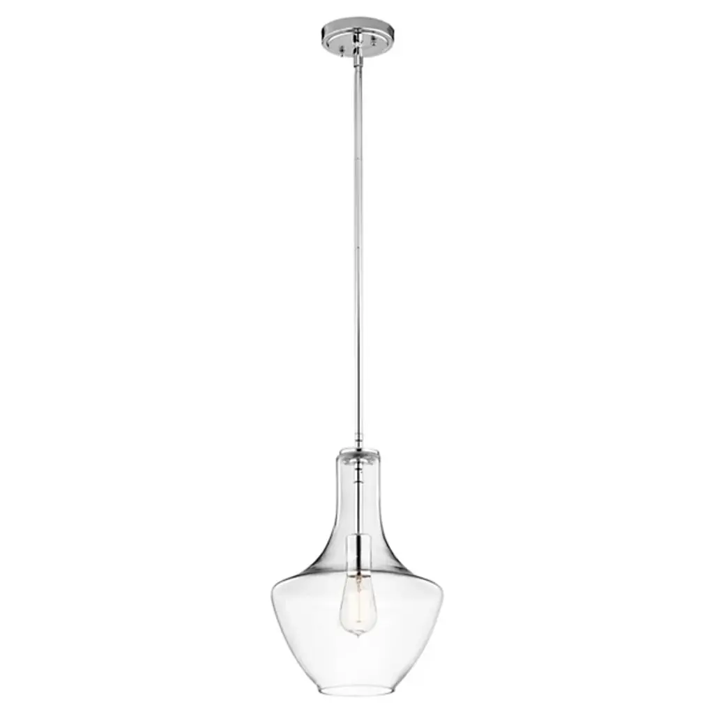 Blown decorative glass containers inspired the design of the delicately decorative Kichler Everly Teardrop Pendant. The wide curves of the Clear glass shade evoke the shape of a classic table lamp and provide a pleasingly soft outline around the exposed bulb within. For warm, vintage twinkle, use with a classic Edison incandescent bulb.