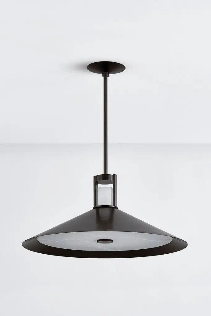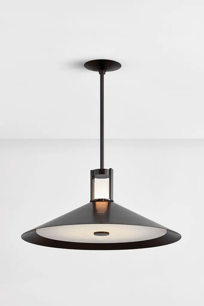 A luxurious basic for modern homes, Evie features a sharply tapered conical shade and energy-efficient LED technology. When illuminated, the light washes over both the flat alabaster diffuser as well as the clerestory, flooding your living space with a soft glow. Available in two sizes and finishes.*Due to the one-of-a-kind nature of the medium, exact colors and patterns may vary slightly from the image shown.