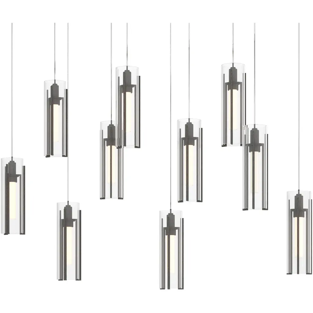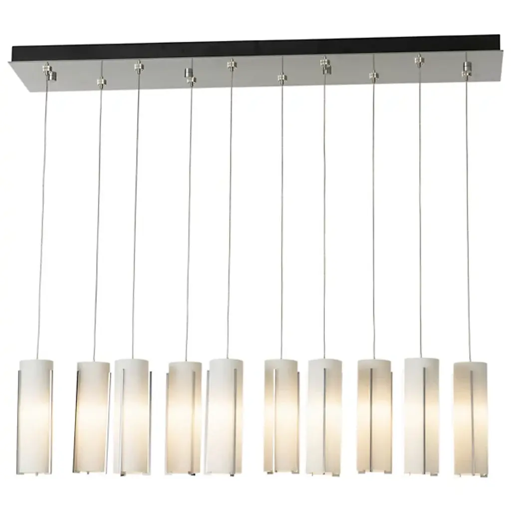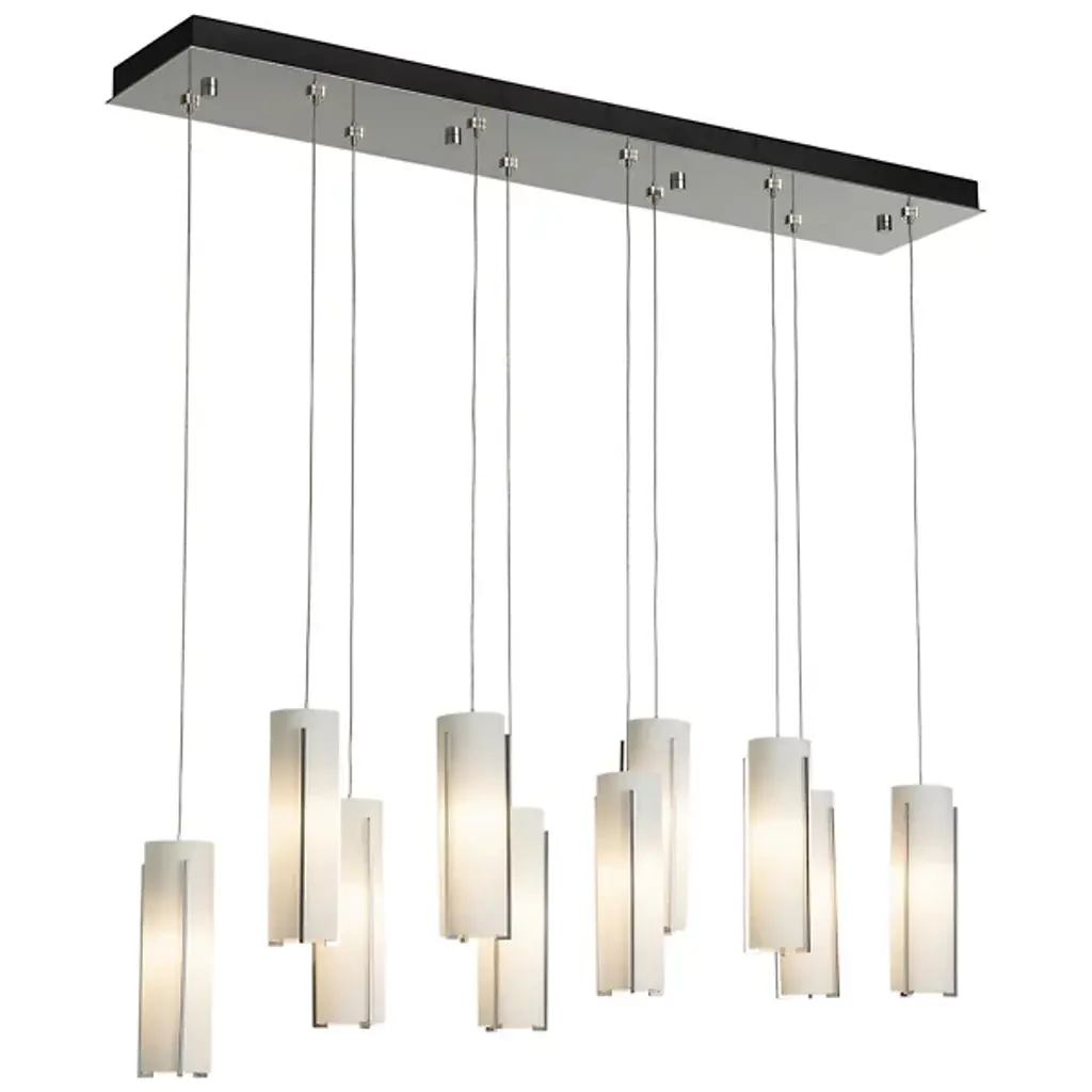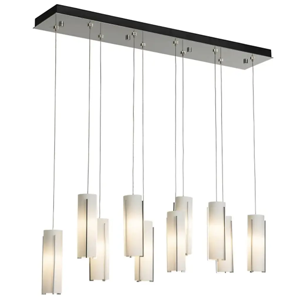 Expect more from your lighting capabilities with the Exos 10-Light Rectangular Pendant by Hubbardton Forge. The term exo translates to the word external, which serves as a clue to the focus of this pendant. Tall glass shades hang in staggered lengths from a slim rectangular base, creating a contemporary canopy of bright light. Barely-there metal supports run vertically up the side of each glass shade. Hang this large-scale pendant above your kitchen island.