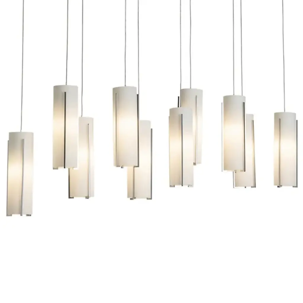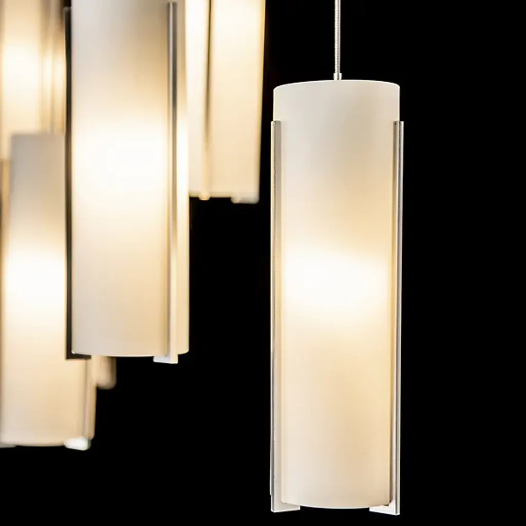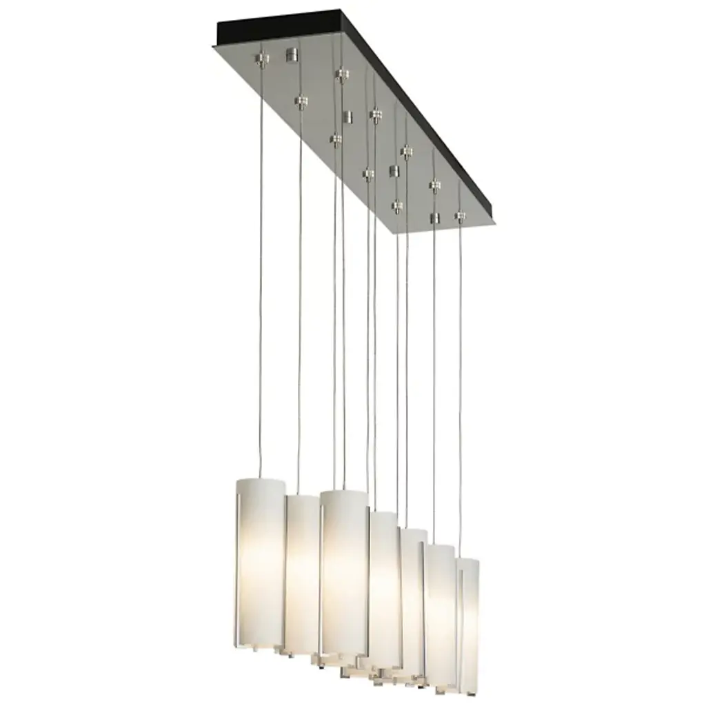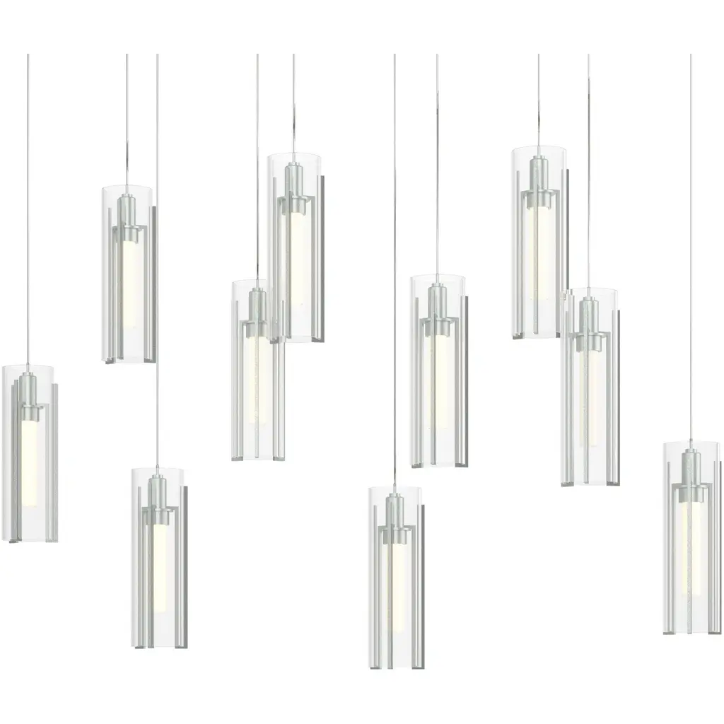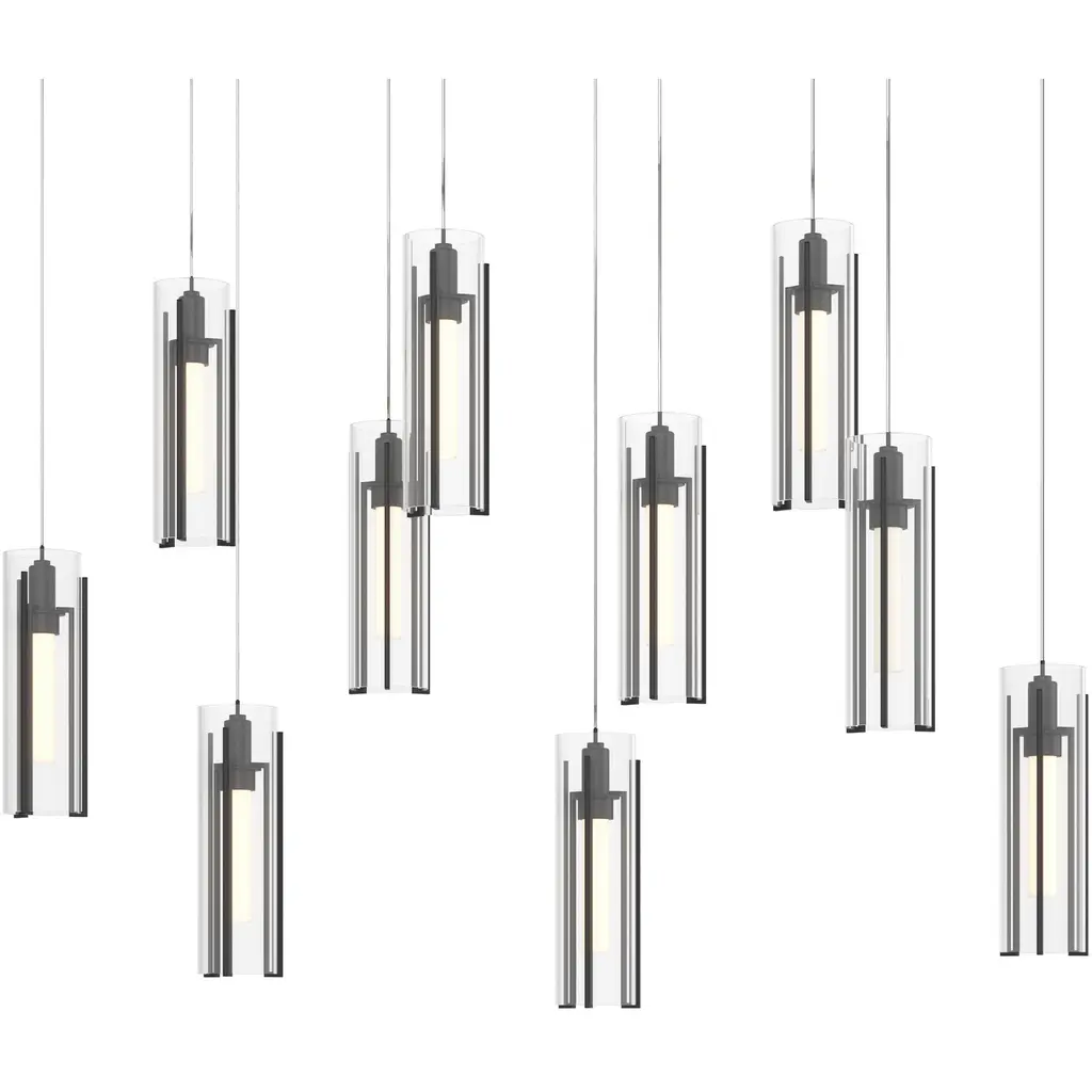 Expect more from your lighting capabilities with the Exos 10-Light Rectangular Pendant by Hubbardton Forge. The term exo translates to the word external, which serves as a clue to the focus of this pendant. Tall glass shades hang in staggered lengths from a slim rectangular base, creating a contemporary canopy of bright light. Barely-there metal supports run vertically up the side of each glass shade. Hang this large-scale pendant above your kitchen island.