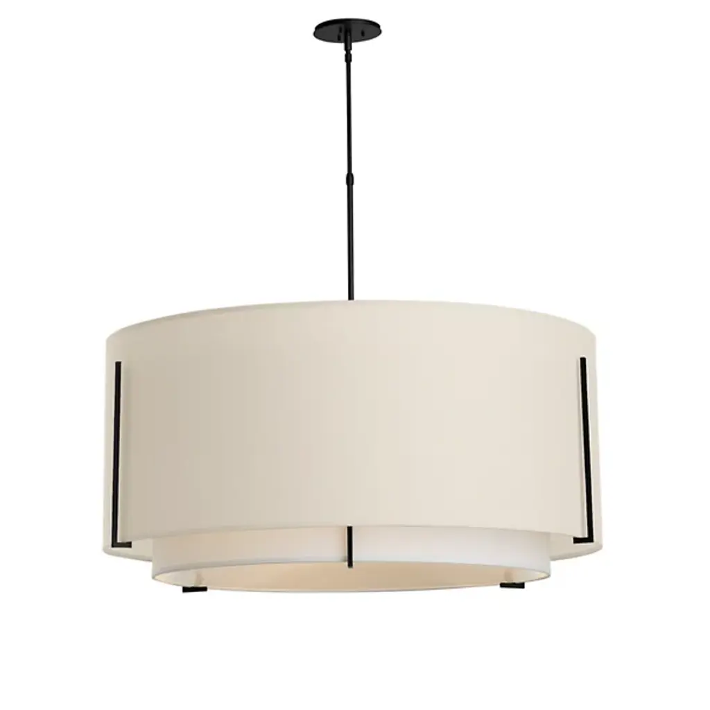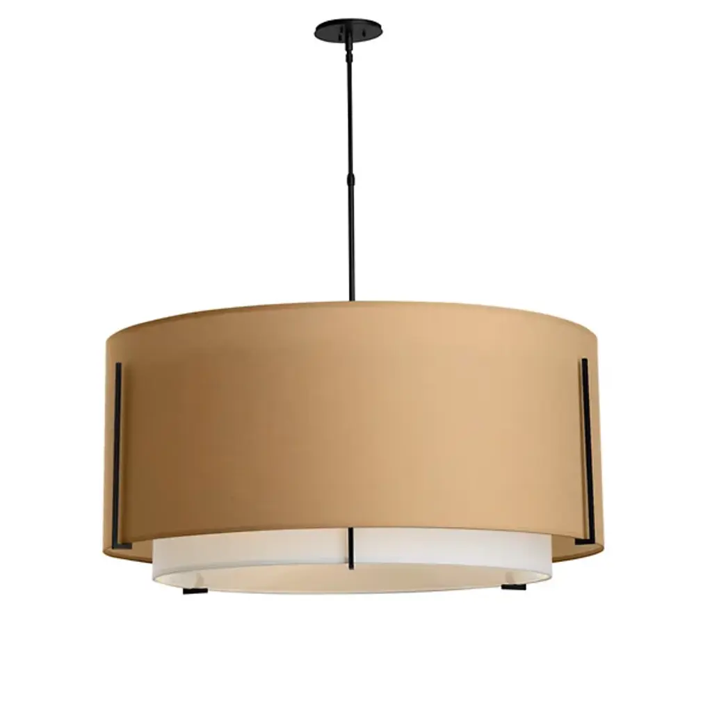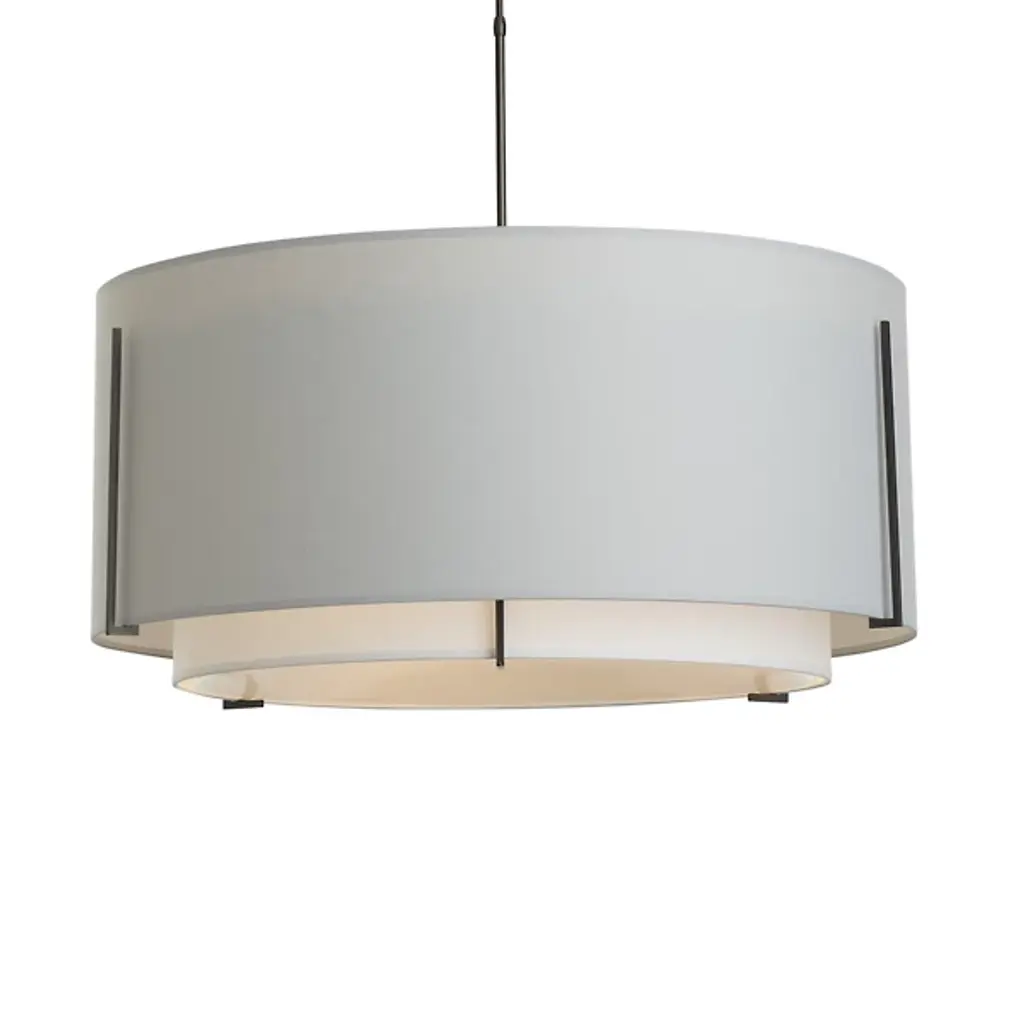 It walks the fine line of being ultra-sleek while also warm and approachable. The contrast makes the Exos Double Shade Large Scale Pendant from Hubbardton Forge an intriguing piece that is sure to please over kitchen islands and counters. Hand-forged steel bars along the sides of the shade have a bold trim quality that contrasts and accentuates the angles created by the piece. A box-shaped fabric shade with a diffuser plate sits nestled inside a bigger shade, and when lit together the piece creates a softened gradient of warm ambient light.