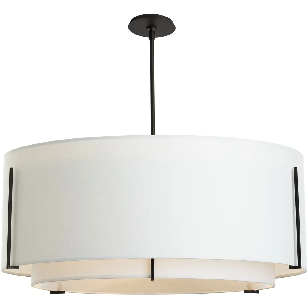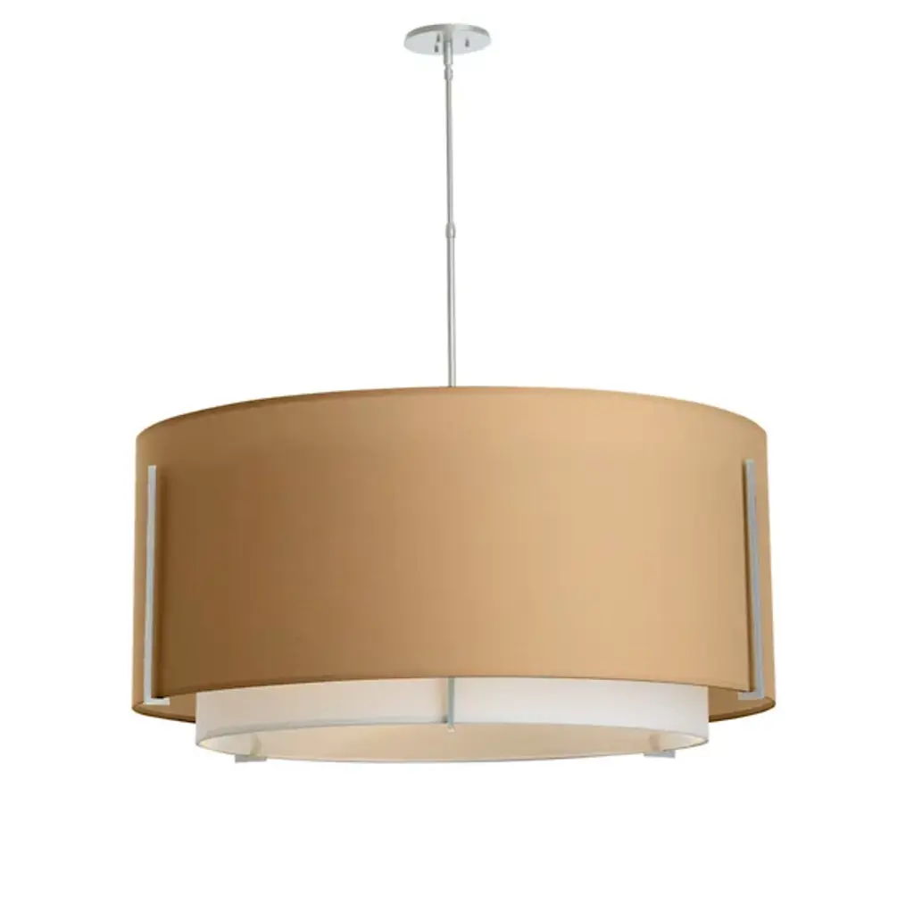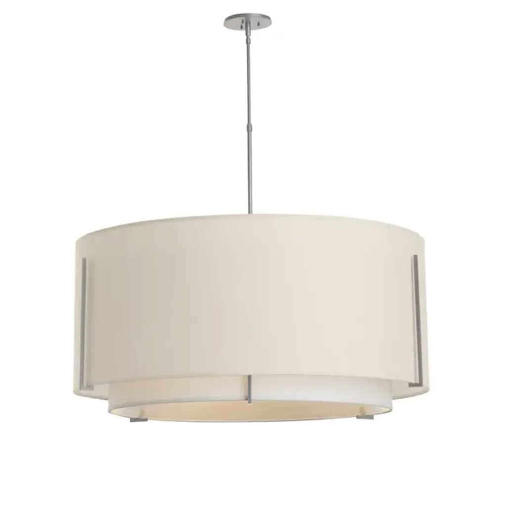 It walks the fine line of being ultra-sleek while also warm and approachable. The contrast makes the Exos Double Shade Large Scale Pendant from Hubbardton Forge an intriguing piece that is sure to please over kitchen islands and counters. Hand-forged steel bars along the sides of the shade have a bold trim quality that contrasts and accentuates the angles created by the piece. A box-shaped fabric shade with a diffuser plate sits nestled inside a bigger shade, and when lit together the piece creates a softened gradient of warm ambient light.