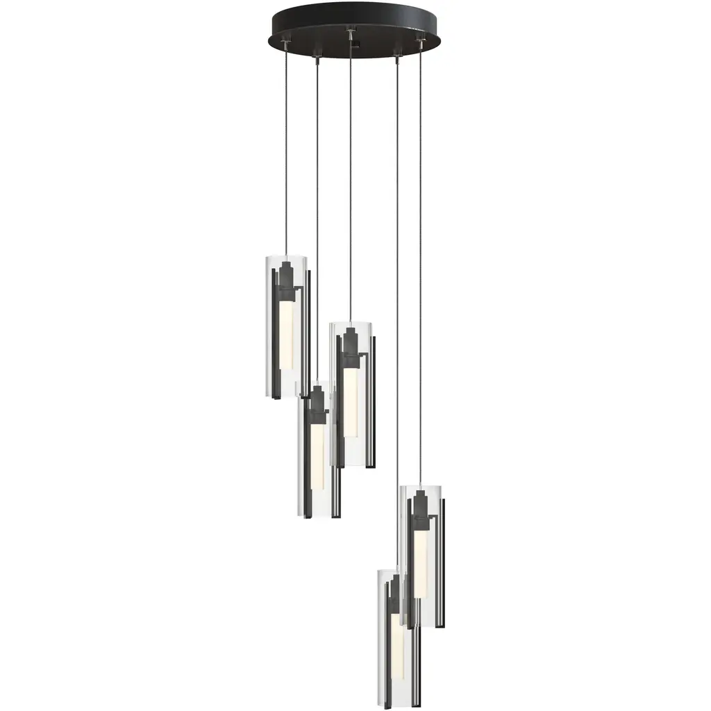 The Exos Collection has a new addition with five cascading pendants clustered on a round multi-port canopy. Individual pendant lengths are customizable to suit the space, making this Exos Glass 5-Light pendant and easy choice. With a substantial range of cable length, this Exos Glass ceiling pendant could make a dramatic statement as a semi-flush or as a cascading focal piece. Tall, vertical, handcrafted steel pieces embrace a glass shade in a choice of opal or clear glass, with an opal inner diffuser.