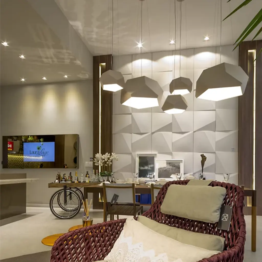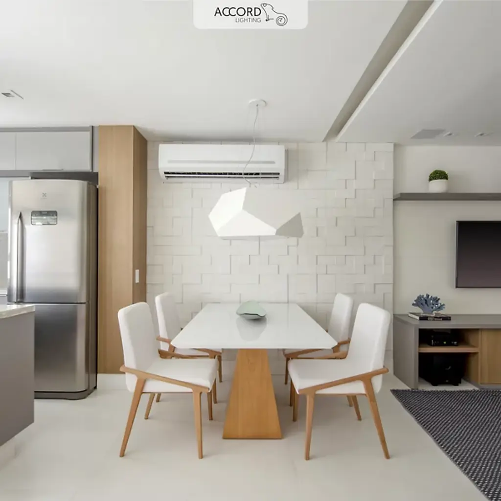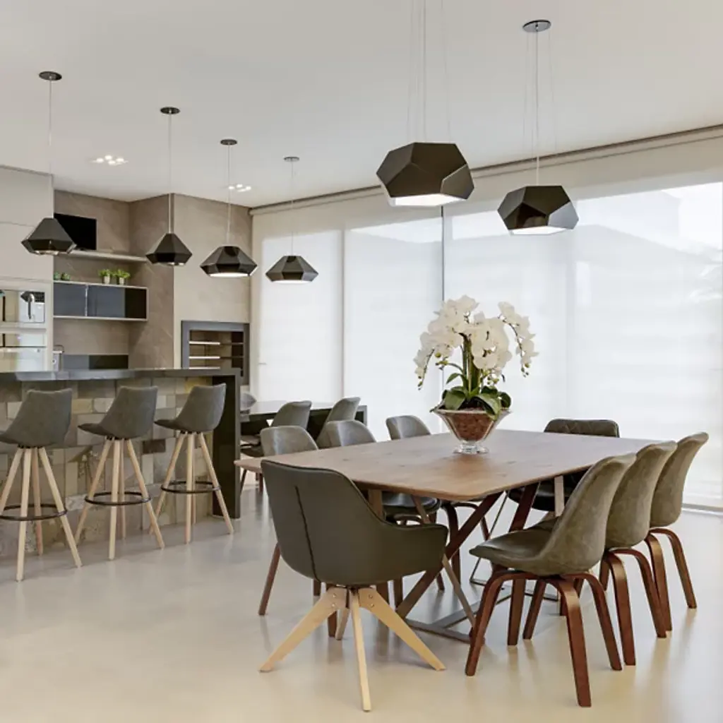 Make a statement with the Facet Dome Pendant by Accord Lighting. A canopy at your ceiling connects to a dome made of MDF wood. This pendant boasts eye-catching pentagonal designs that cover its surface, creating a drawn look that resonates with onlookers. The opening at the base of the pendant continues this geometric motif, providing a space for an LED to diffuse light throughout your room. This versatile fixture gives your Rustic Modern layout a chic appearance while sufficiently lighting your gatherings.