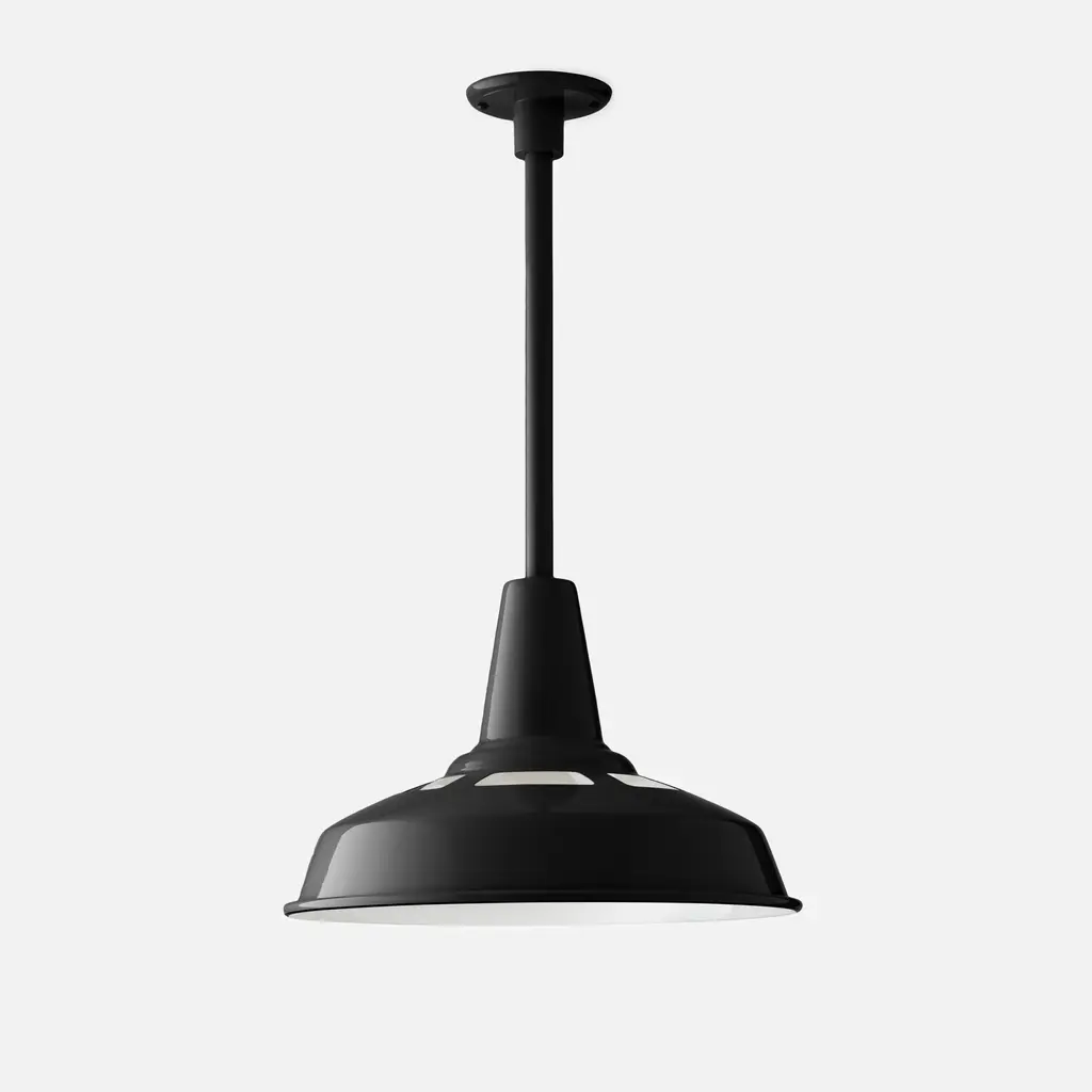 Industrial and utilitarian, the Factory Light No. 5 Rod Pendant is a perfect example of traditional factory-style lighting made popular in the 1930s. Extra-wide opening allows for maximum cast light, and top cutouts add a sleek design element with the added function of releasing excess heat. Assembled in our Portland, Ore. factory using ethically-sourced domestic and global components. Made from powder coated, hand-spun steel and produced on an RLM tool made exclusively for Schoolhouse.