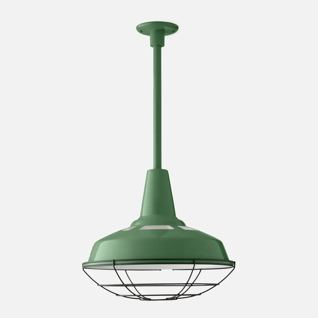 Industrial and utilitarian, the Factory Light No. 5 Rod Pendant is a perfect example of traditional factory-style lighting made popular in the 1930s. Extra-wide opening allows for maximum cast light, and top cutouts add a sleek design element with the added function of releasing excess heat. Assembled in our Portland, Ore. factory using ethically-sourced domestic and global components. Made from powder coated, hand-spun steel and produced on an RLM tool made exclusively for Schoolhouse.