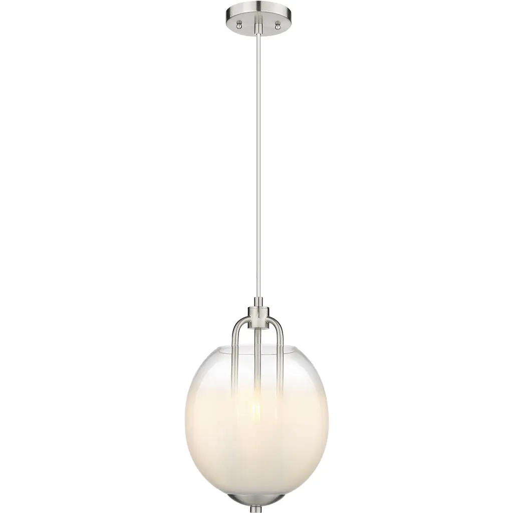 The striking design of the Fall Brook Pendant is breathtaking and unmistakable. A simple architectural metal frame plunges into the ombre shaded glass globe and is neatly held in place by a curved accent plate. The beauty of the fixture is evident in the way the clear mottled glass elegantly fades into white. This pendant is unique and will be the focal point of a room.