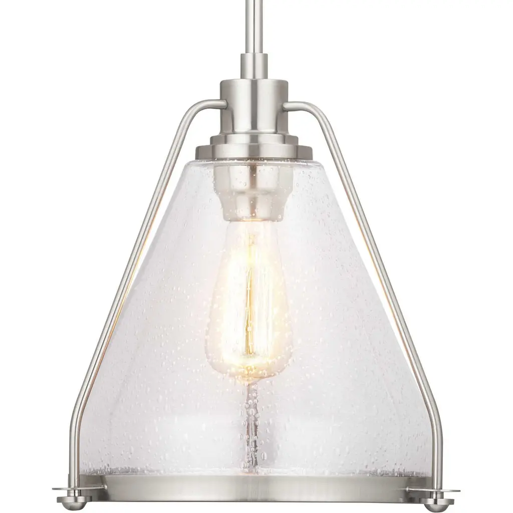 Fano features a classic triangular clear seeded glass shade. The simple geometric glass is outlined with a Polished Nickel slender frame and finished with a bottom metal accent ring. Simple and stylish, this versatile style is suitable for a variety of designs, such as Modern, Farmhouse and Urban Industrial.
