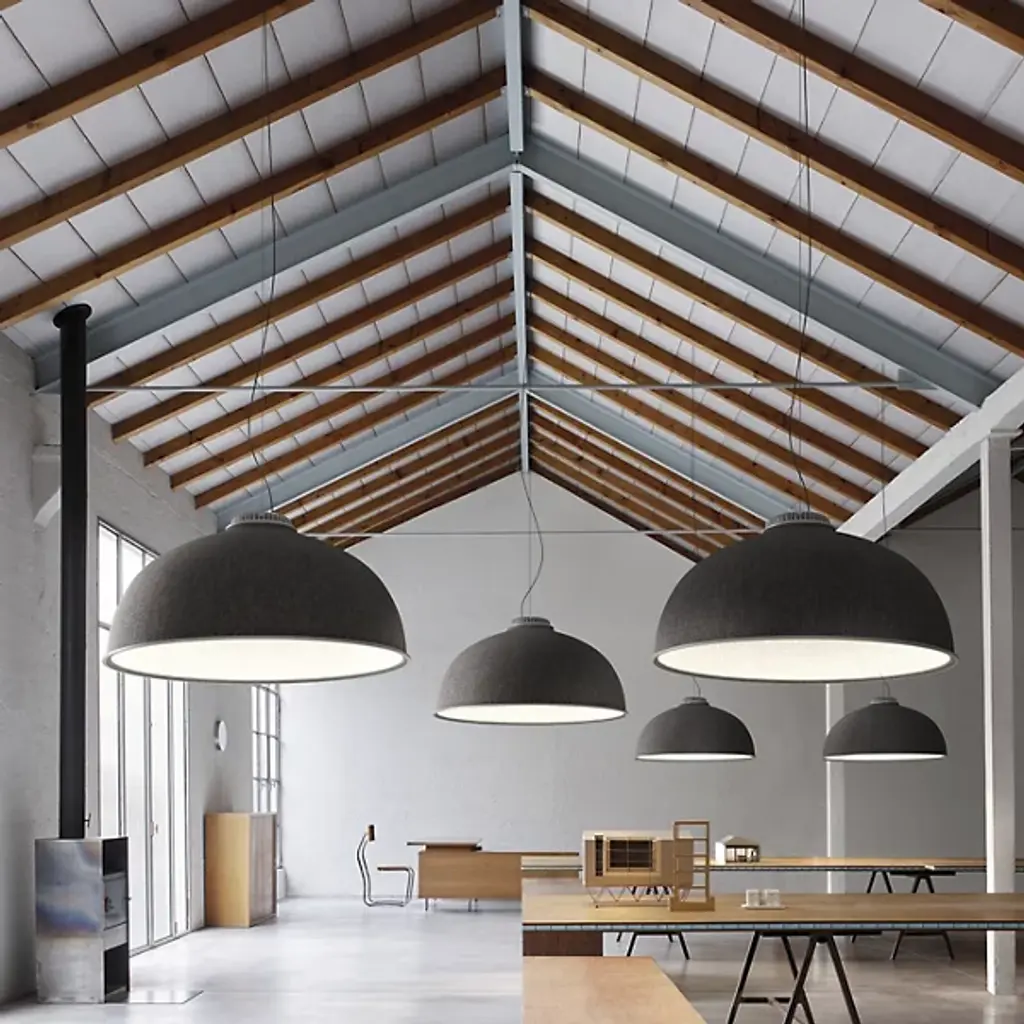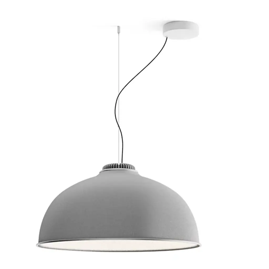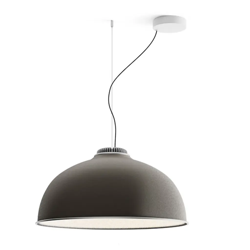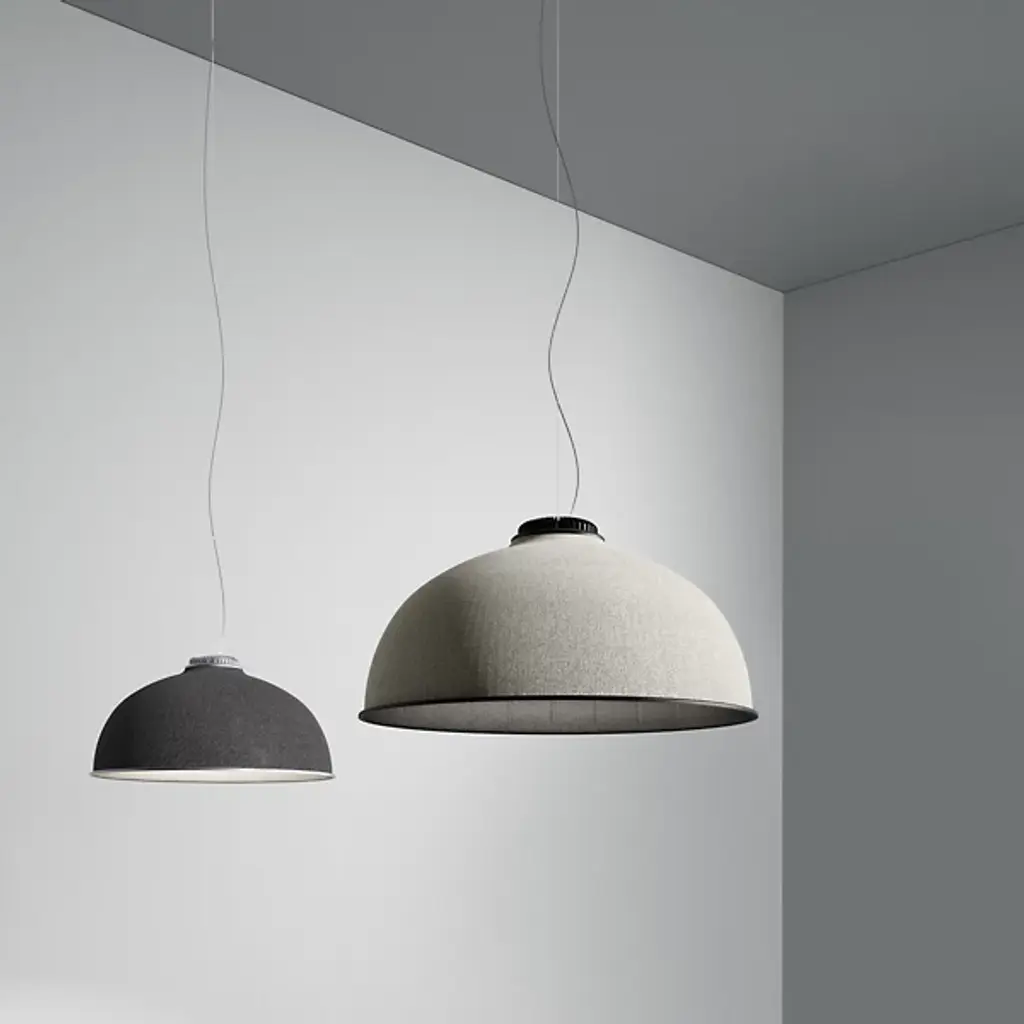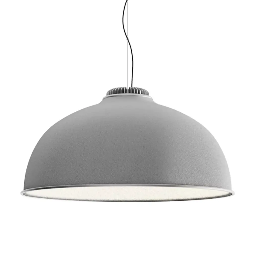 Presented by Luceplan, the Farel Acoustical Pendant is an innovative lighting fixture that showcases a smooth dome structure. Crafted with sound-absorbing thermoformed material, the Farel Acoustical Pendant provides not only visually pleasing aesthetics but also exceptional acoustic performance. The outer fabric cladding adds a touch of elegance while enhancing its sound-absorbing capabilities. Designed by the talented Diego Sferrazza, this pendant light embodies the finest craftsmanship that Italy is renowned for, while its production incorporates recycled elements, reflecting a commitment to sustainability and environmental consciousness.
