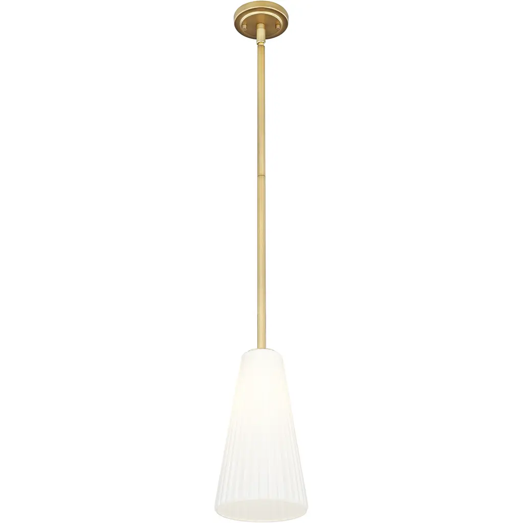 Embrace the elegant warmth of a sophisticated modern gold finish in this contemporary one-light pendant. Its flared silhouette is established with fluted, frosted glass that shades the light to deliver inviting, diffused illumination in any setting. Clean lines define the design, while delicate fluting adds the perfect touch of movement and fluidity.