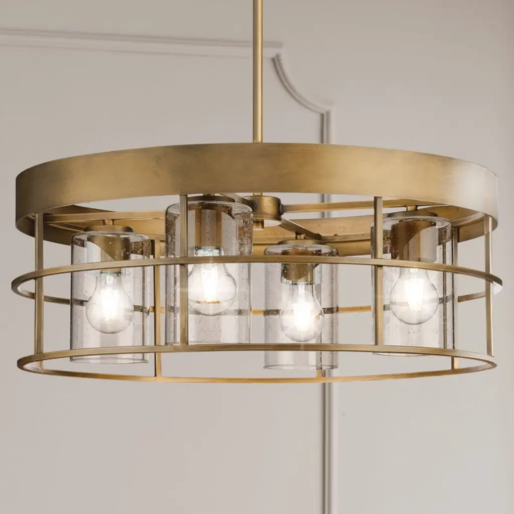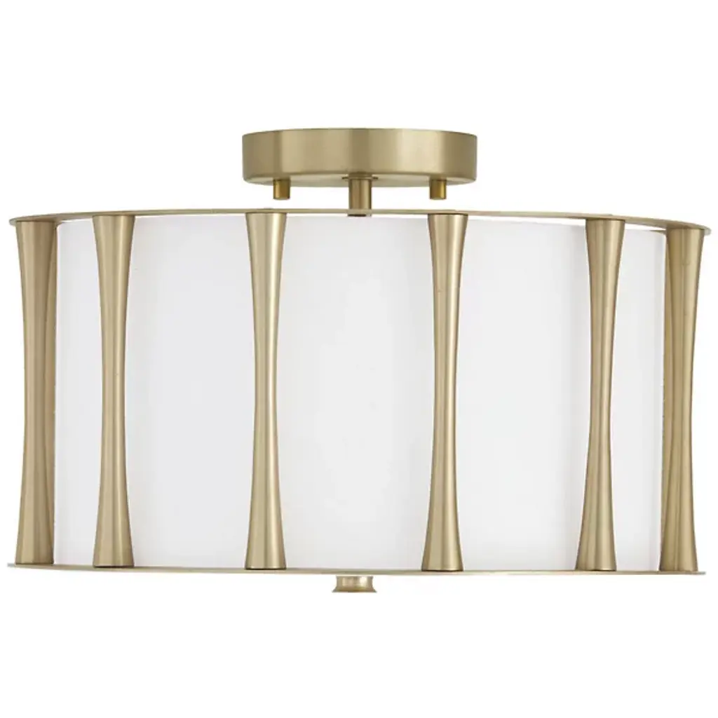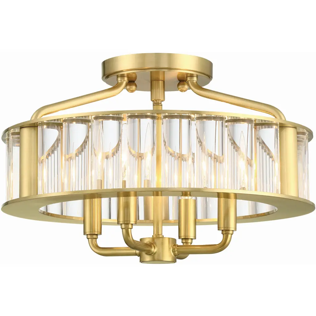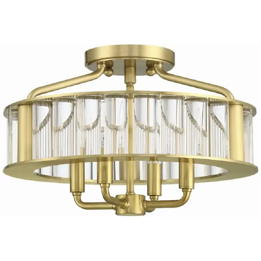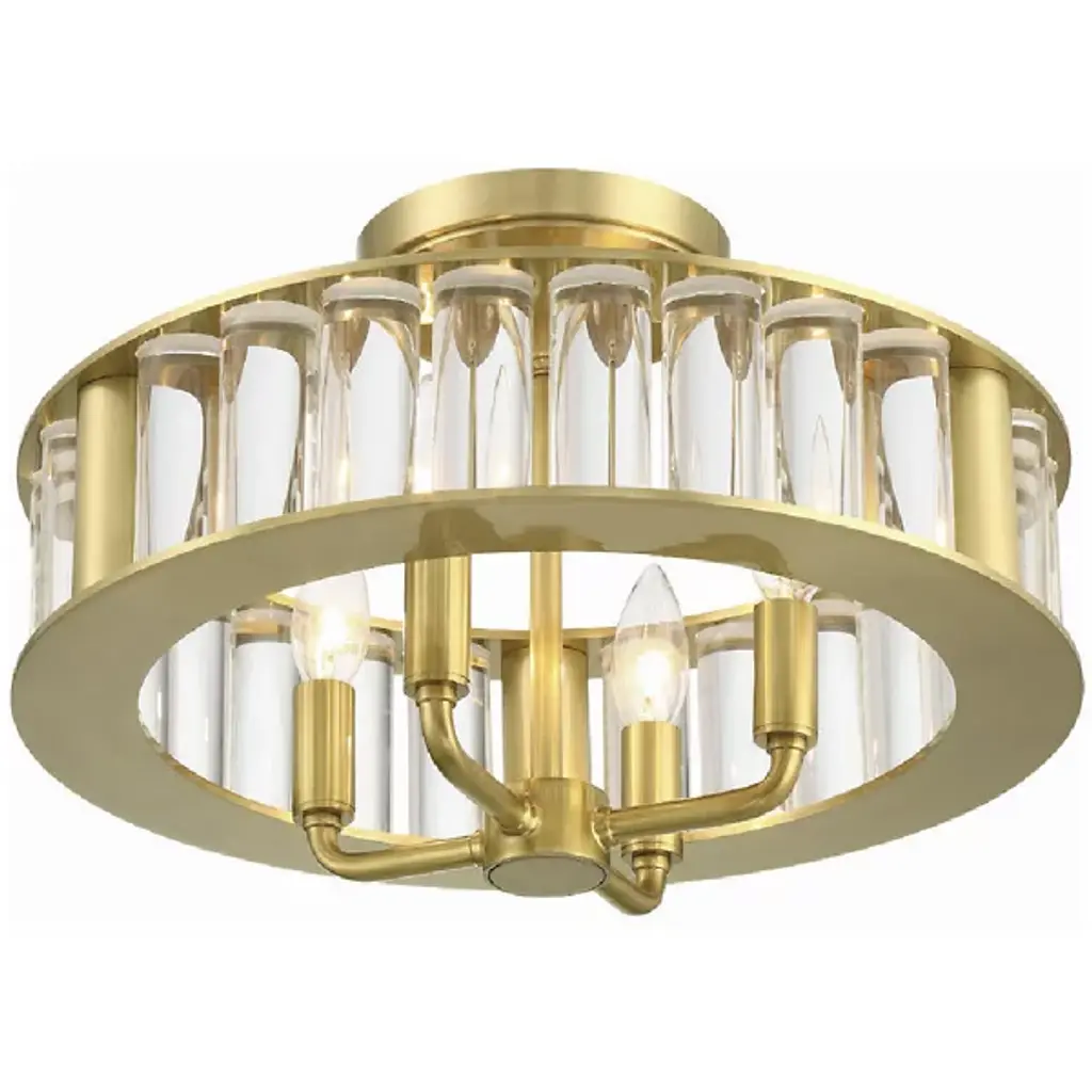 The Farris Semi-Flushmount from Crystorama is designed by Libby Langdon. It is secured by a ceiling canopy and is composed of refined steel. The drum-shaped framework gives it a transitional look and adds functionality. This framework is complemented by clear glass that elegantly conceals a group of candelabra-style LEDs for an even glow. Adjust the brightness level easily using a separately sold ELV dimmer. Place this versatile lighting solution in kitchens, bedrooms, and more.