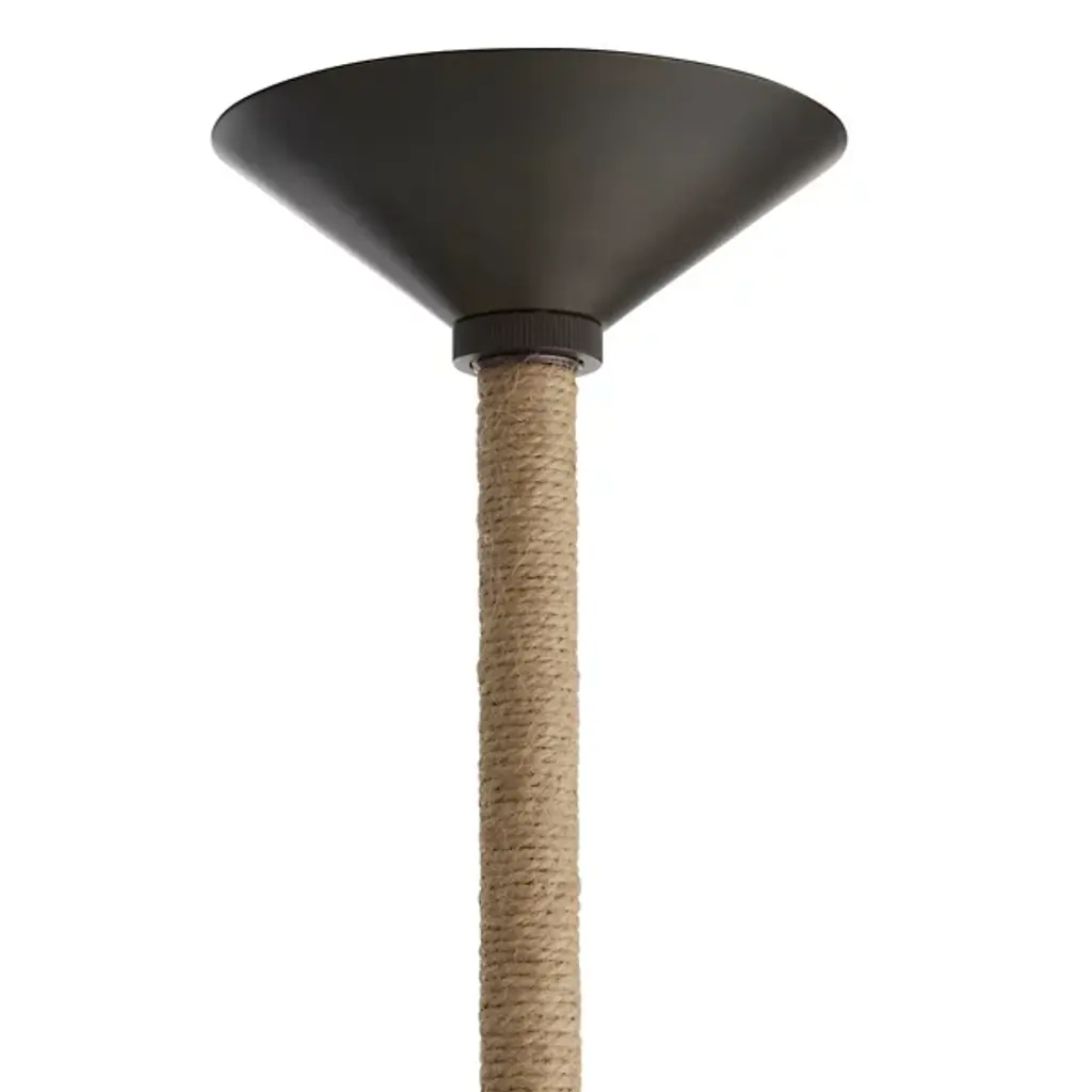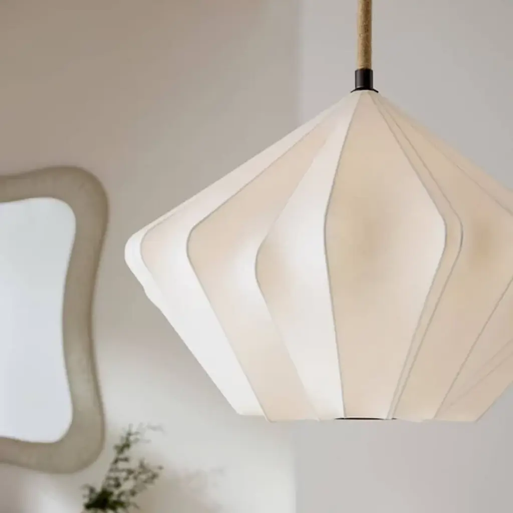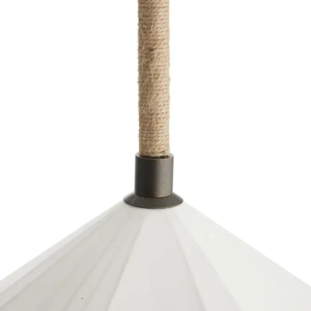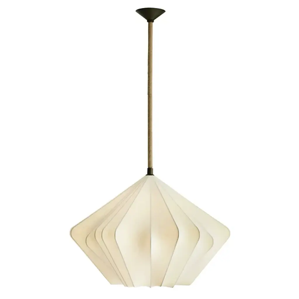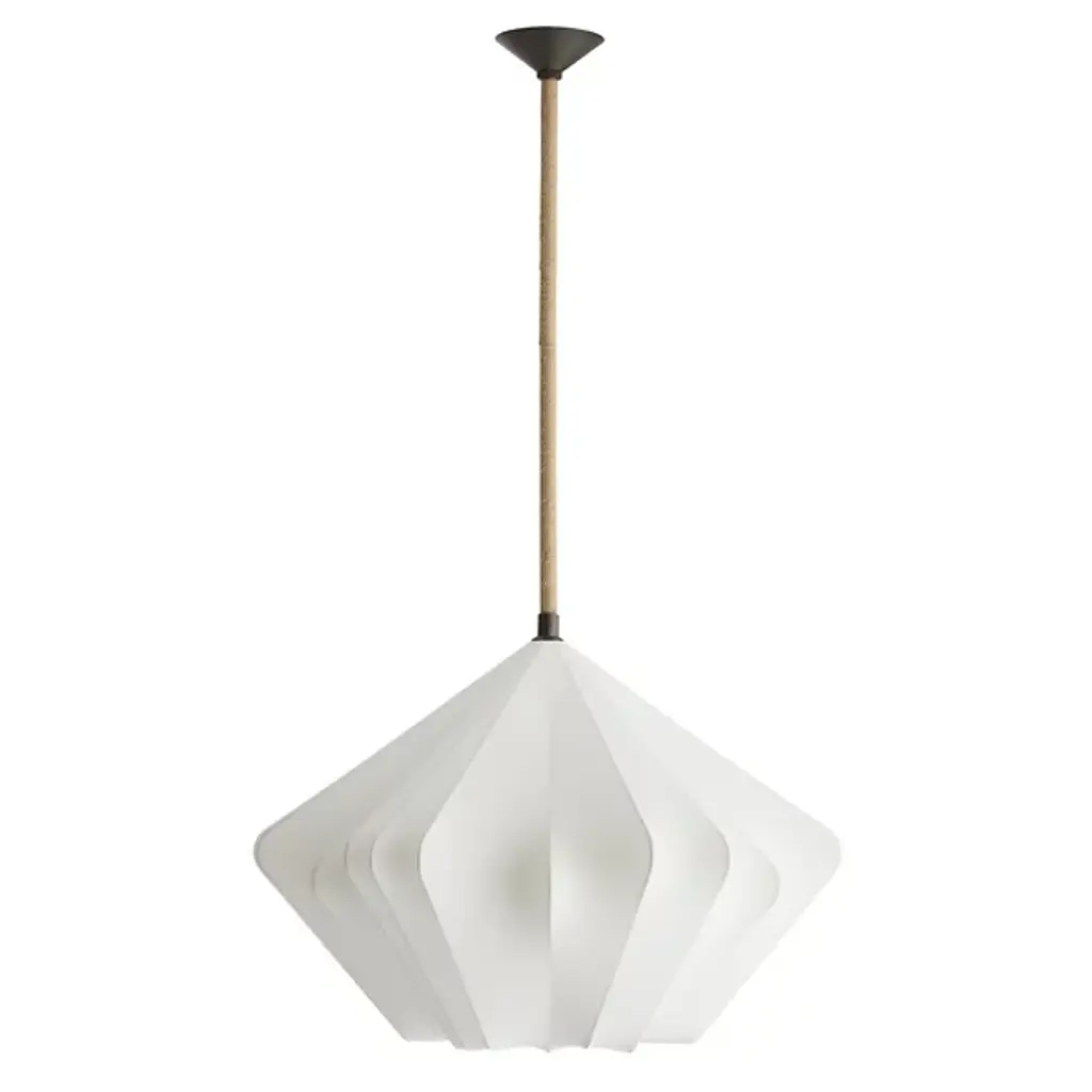 The Fazekas Pendant from Arteriors draws inspiration from origami art, with faux vellum panels folded into a dynamic diamond formation. The natural rope-wrapped pipe suspension adds an organic touch to its geometric precision. This pendant's open-bottom design allows light to filter through the carefully arranged panels, creating gentle shadows that move across your space. The English bronze-plated steel frame provides structural stability while maintaining the fixture's airy appearance. With an adjustable hanging length, this dimmable piece is ideal for those who appreciate the delicate balance between artistry and engineering.