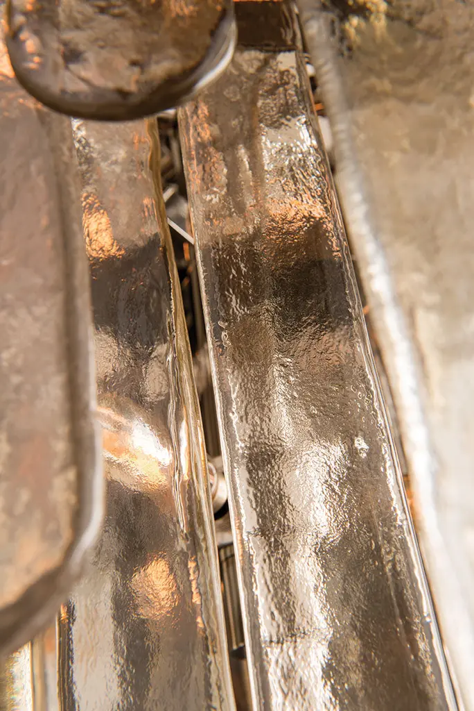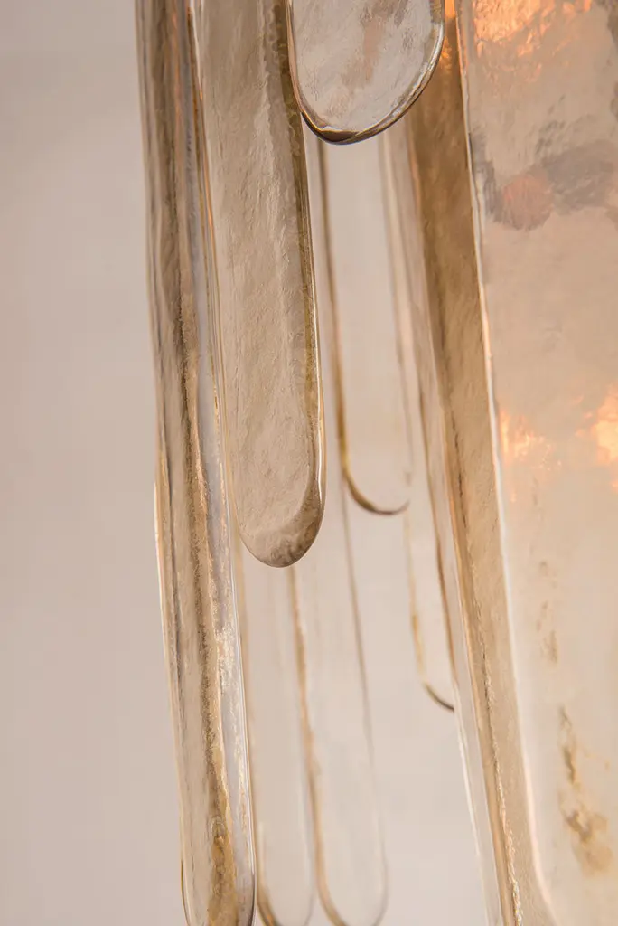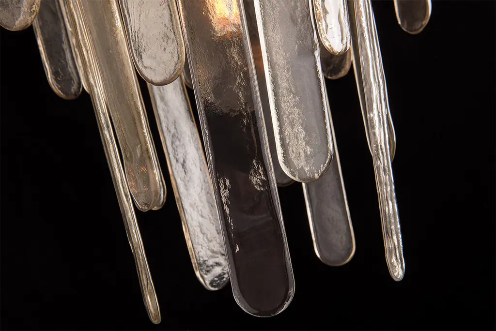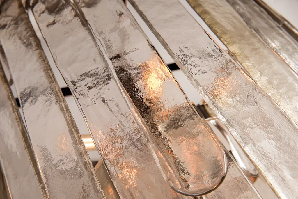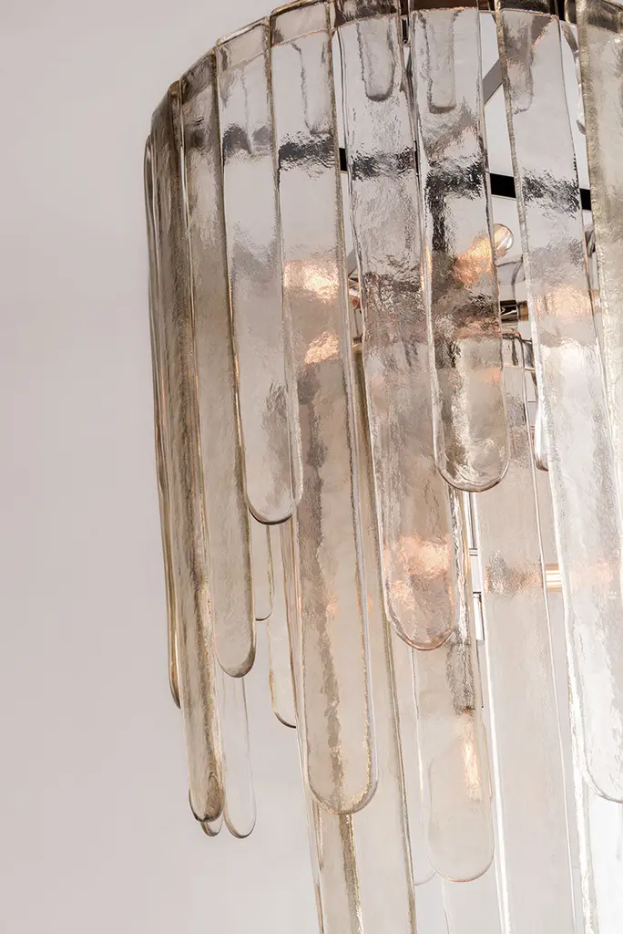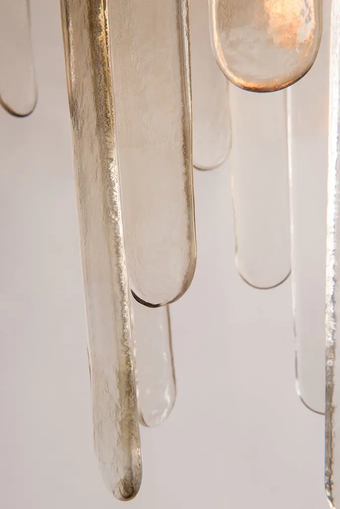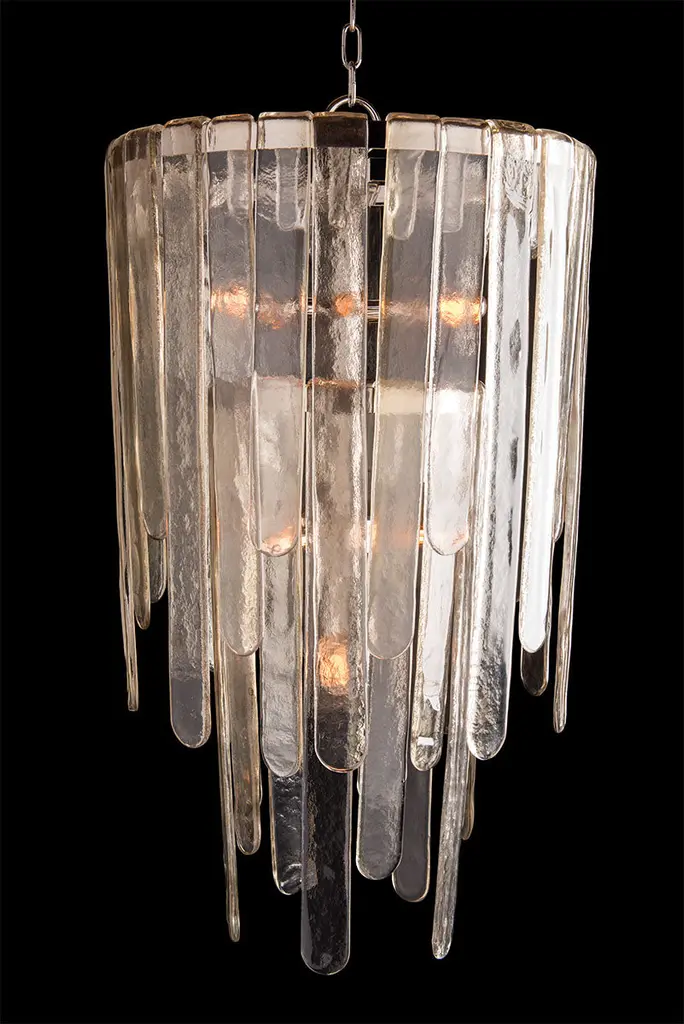 The trial-and-error nature of our creative process made Fenwater a delightful discovery, where the end product exceeded its initial intent. Here’s how it works: our artisans pour molten glass into molds of three different lengths. By design, the glass is rough and champagne-hued to suggest a degree of antiquity. The hooked glass panels hang in a three-layered cascade in staggered lengths. The resulting appearance is at once warm and woozy, watery and icy. SpecificationsWidth/Diameter: 20"Height: 35.75"Min - Max Height: 41.75" - 93.25"Backplate/Canopy/Base: 5.5"Shade Material: GlassNumber of Lamps: 9Wattage: 60w ea.Socket Type: E12 Candelabra Base And BulbShipping Info:Please allow 4-6 business days to receive tracking. Depending on the quantity, finish and fixture selected lead times and estimated delivery schedule may vary.
