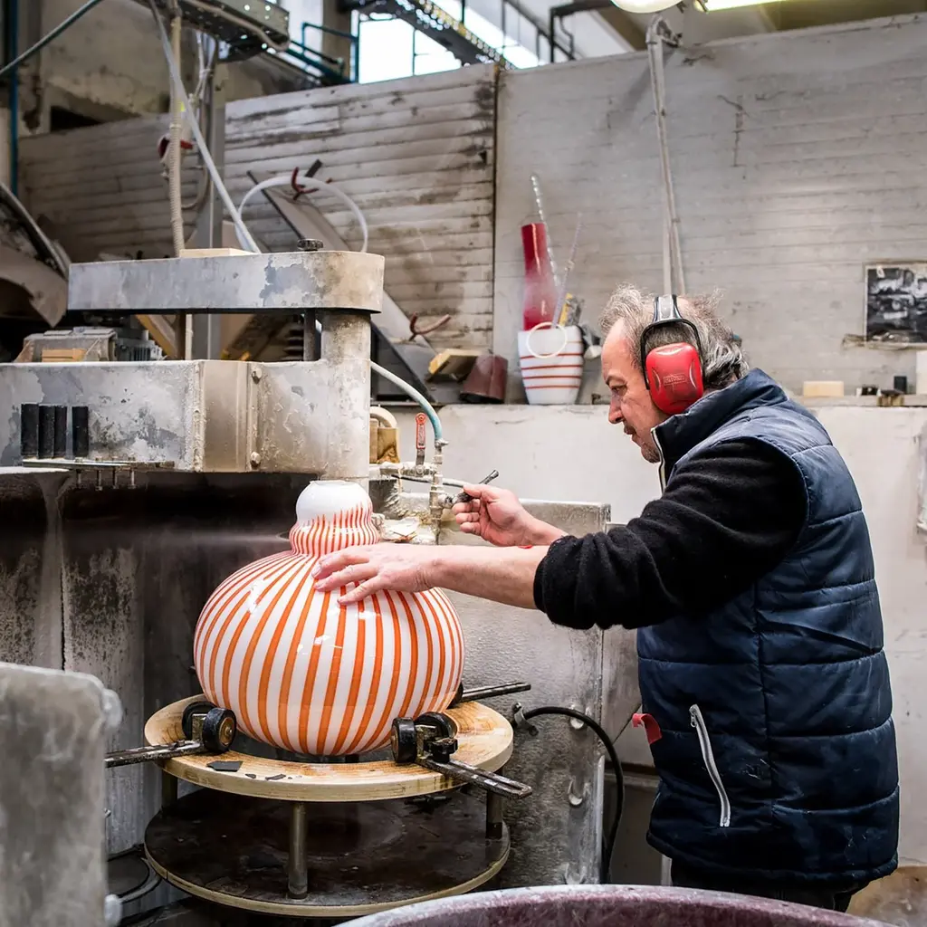 Grouping variously sized and shaped Filigrana pendants in a kaleidoscopic cluster definitely commands a second look, says its creator Sebastian Wrong. Available in 3 fixed compositions of Cylinder and Ellipse models, the mouth-blown, Venetian-glass shades sport a candy-like pattern that originates in a glassblowing technique dating back to the 16th century. A spot of color is spun into delicate stripes—and the artisanal process makes each fixture completely unique. Suspended from a white powder-coated ceiling plate with matching positioning bars and clear PVC clear cables, the grouping provides gently diffused illumination with an irrepressible flourish.