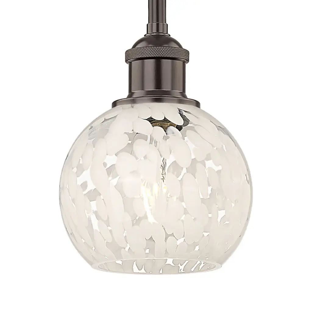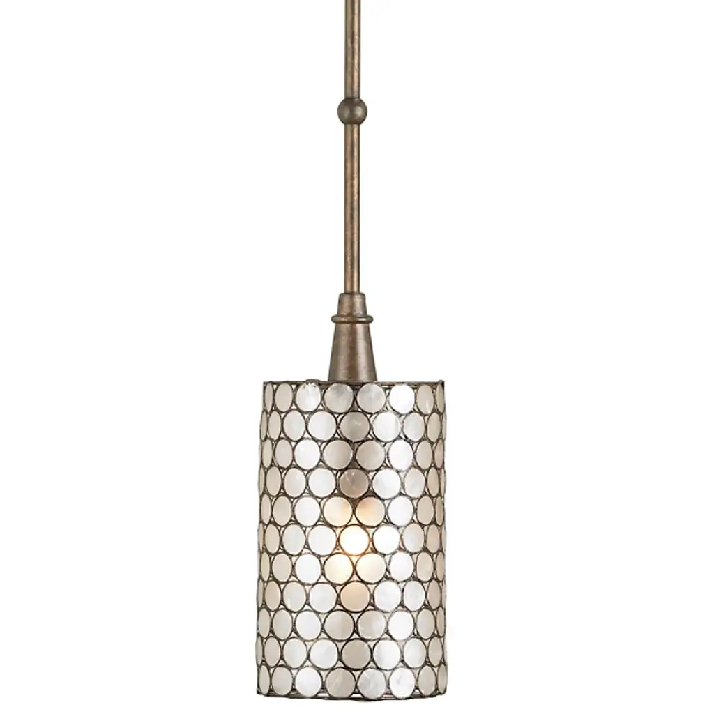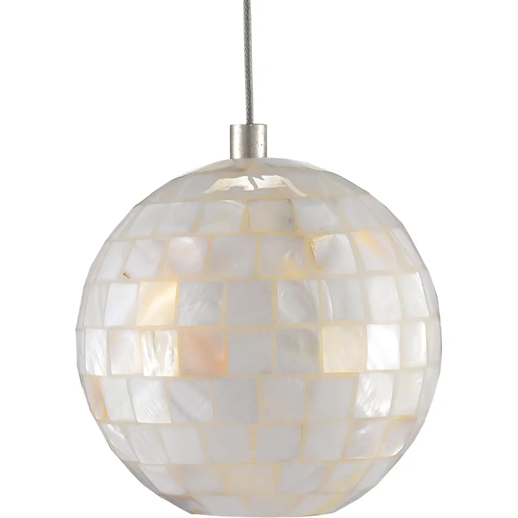 The Finhorn 1-Light Multi-Drop Pendant has an orb-shaped shade covered with small squares of mother of pearl, painstakingly hand-applied. The stem and canopy of the white pendant light are in a painted silver finish to keep the composition light. This fixture is among Currey & Company’s introduction of cluster lights, which includes 1-light up to 36-light configurations. We also offer the Finhorn in an orb pendant.