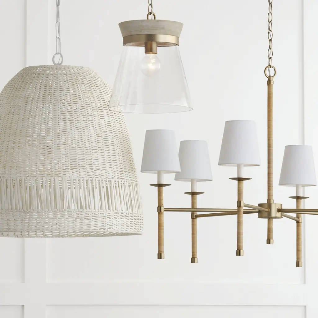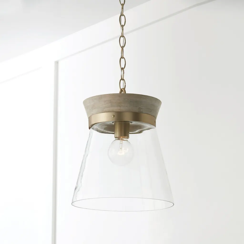 Effortlessly blending Matte Brass with white-washed mango wood, the Finn Pendant creates a sophisticated aesthetic. The crisp angles paired with clear glass add elegant dimension to this classic style.