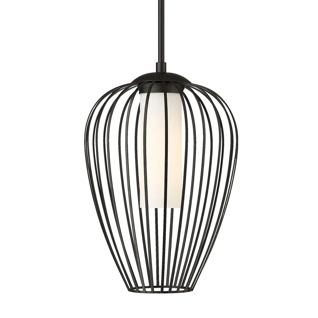 The one-light pendant from the Finn collection takes a new perspective on an open cage design. The beautifully graphic frame in a matte Black finish wraps around an etched white glass shade creating a focal aperture for a single bulb. Black finish.