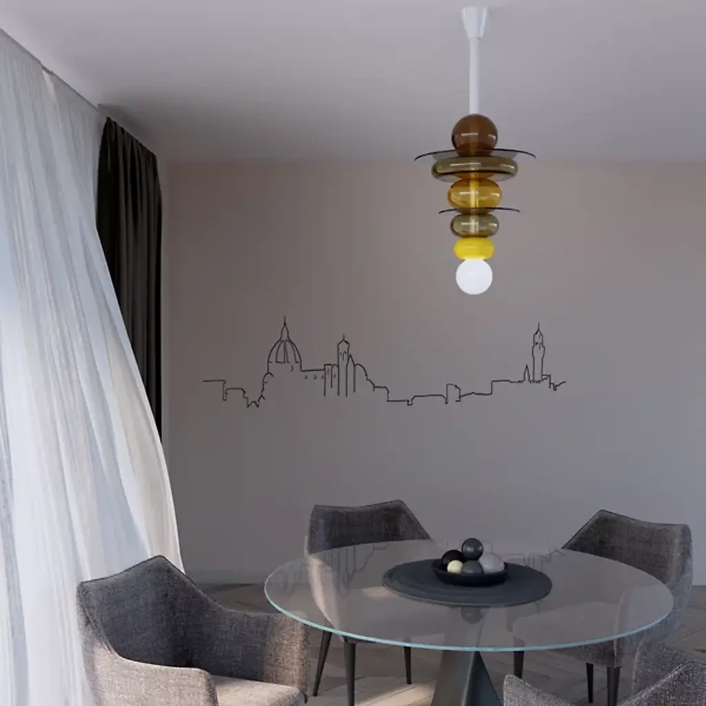 The Firenze Pandent from Venini adds artistic and vibrant geometric forms to its surroundings. A design by Ettore Sottssass made In Italy, it brings designer decadence to its surroundings with a glittering warmth and stately ambiance descending from a conical canopy via a slim downrod. A series of rounded Murano Glass beads accent the stem, accompanied by rounded metal discs, transforming the simple metal into smooth and outstanding artistry that leaves a lasting and layered impression around it.