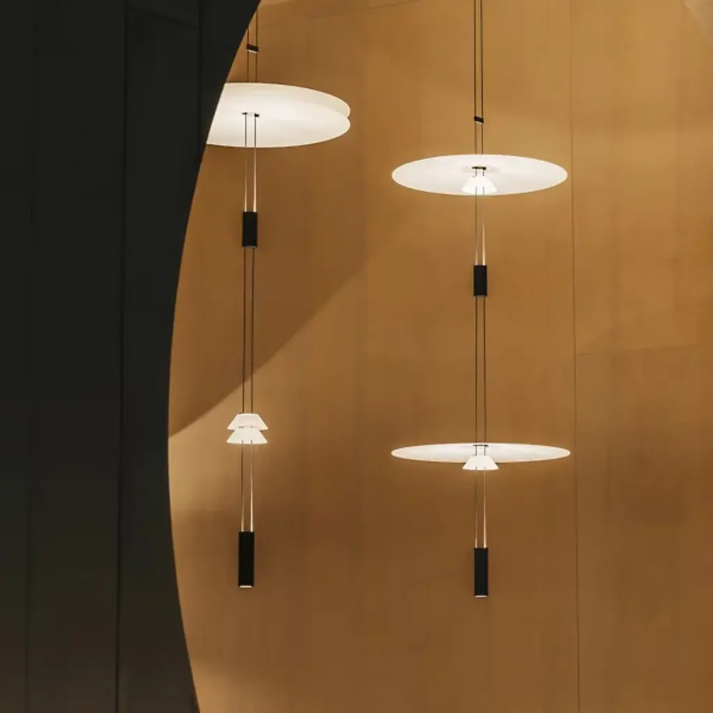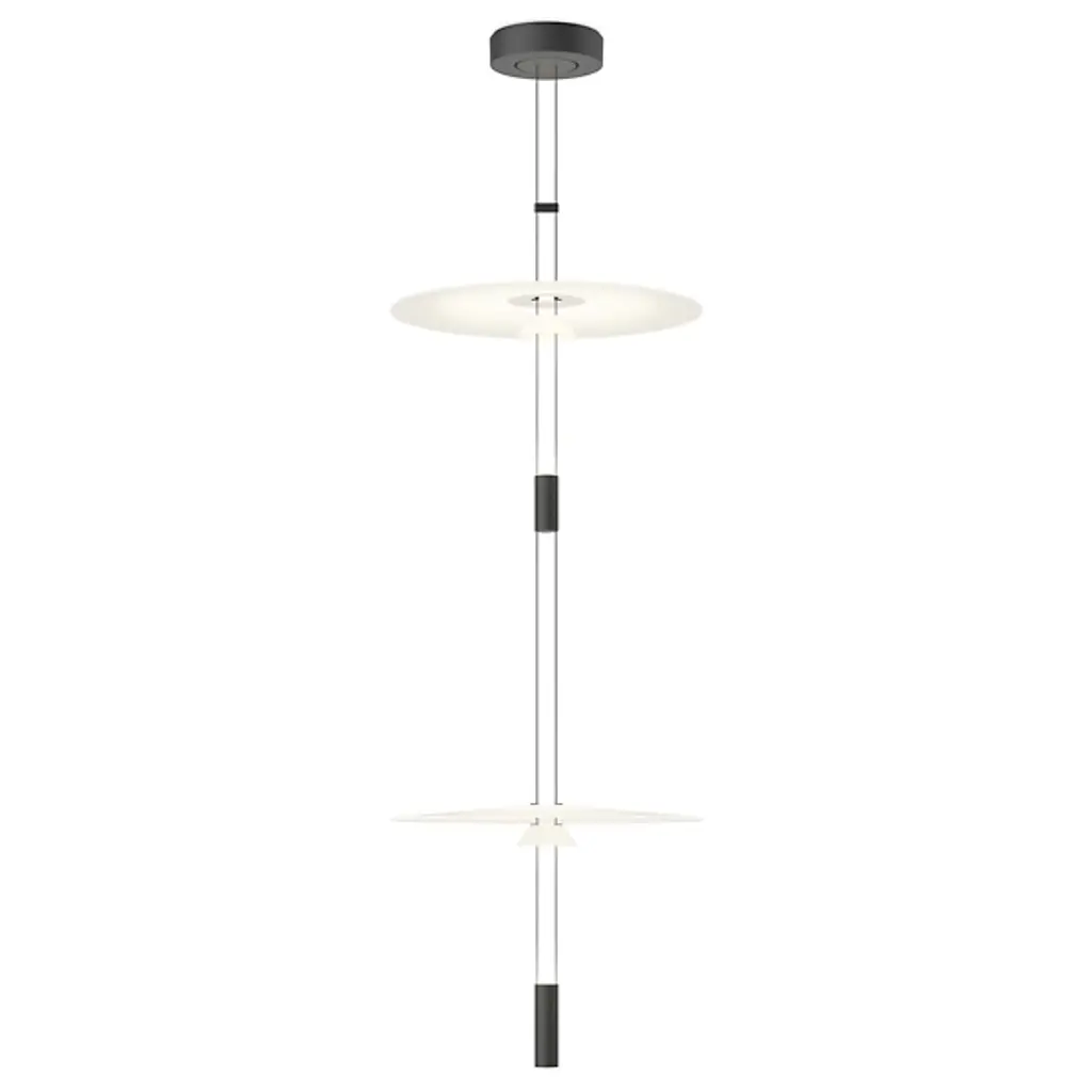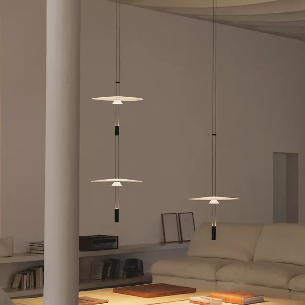 The Flamingo Mini 1590 LED Pendant from Vibia brings a refined, airy presence to interiors with its elegantly elongated form. Designed by Antoni Arola and made in Spain, this pendant features two large upper dish shades and two smaller flared lower shades, suspended by slender cables that support the LED light source. By separating the energy-efficient LEDs from the delicate shades, the design creates a floating effect reminiscent of a bird in flight. The LEDs function as spotlights, casting soft, ambient illumination upward and downward for a striking column of light.