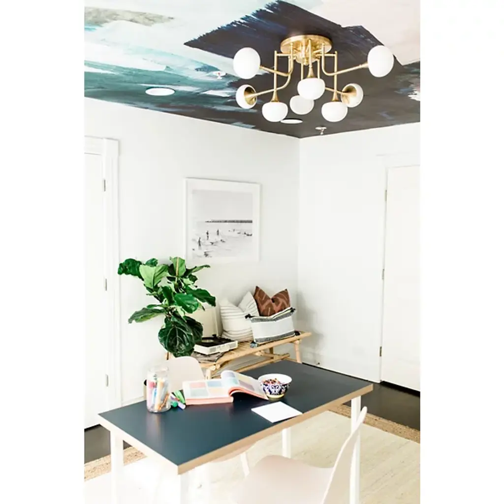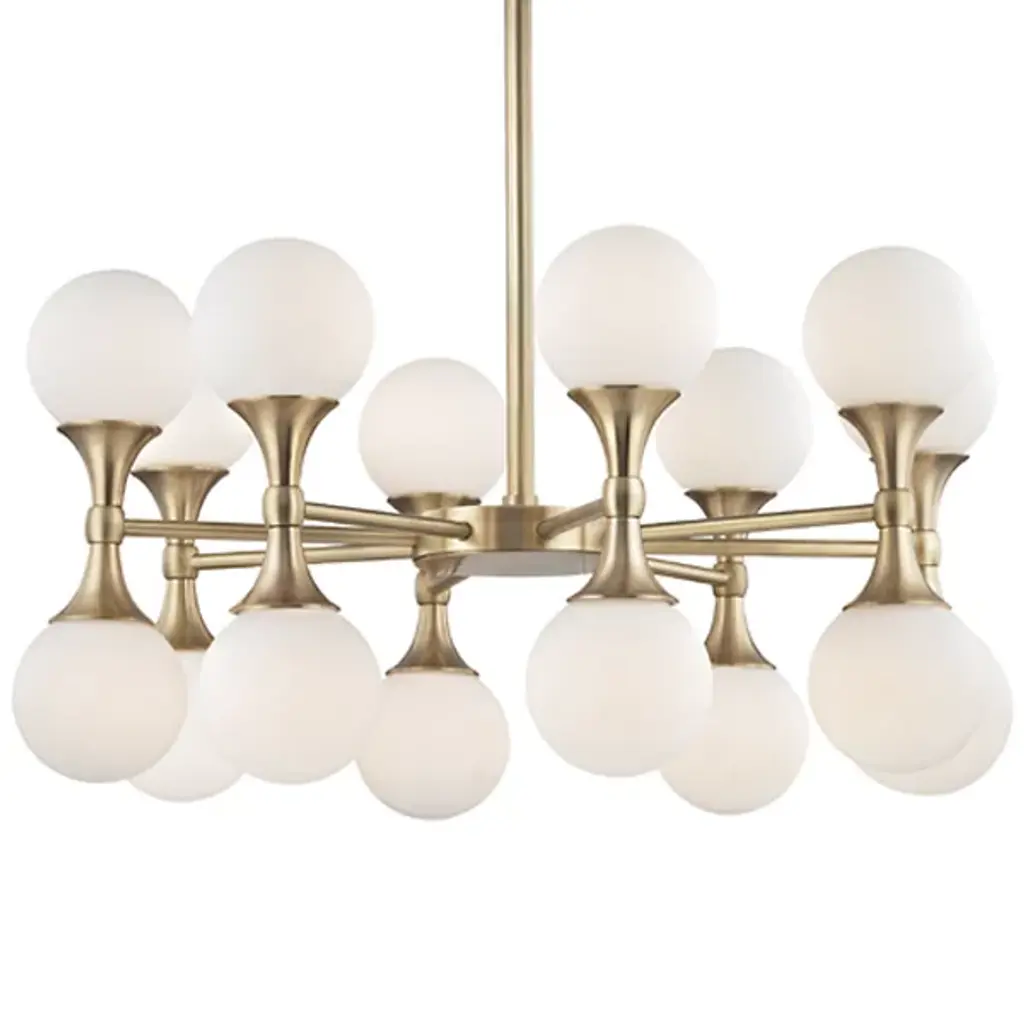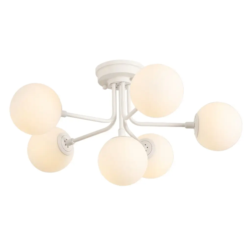 The Fleming LED Semi-Flushmount by Hudson Valley Lighting features a stunning assortment of Opal Glossy glass shades supported by an intricate, multifaceted frame. Each luminaire has a unique orientation with respect to the canopy, collectively producing a widespread ambiance that is both fashionable and functional. Light is generated by replaceable LED modules, ensuring convenient, long-lasting usage.