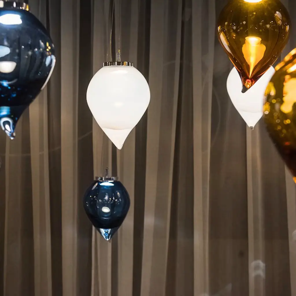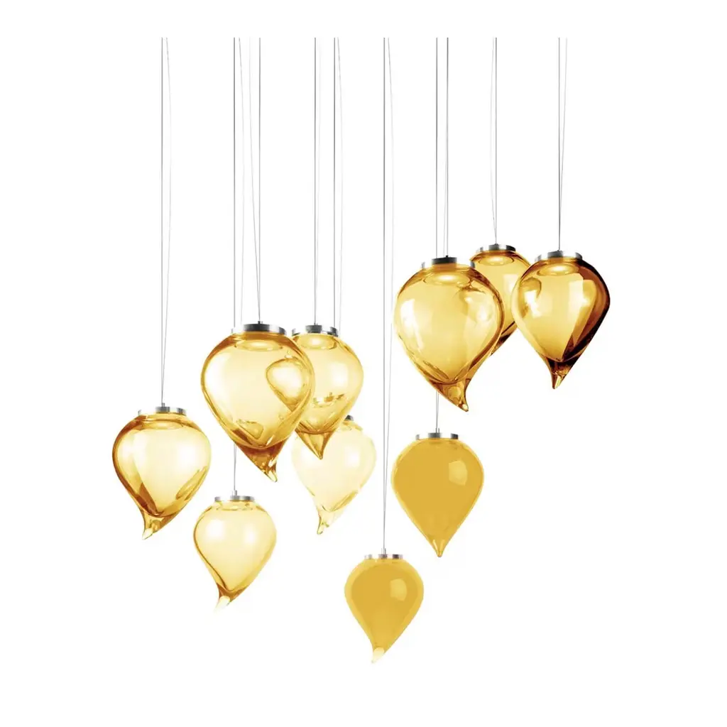 A stunning and lively addition to a modern home, this exquisite chandelier was crafted of mouth-blown Murano glass, combining traditional craftsmanship with the contemporary aesthetic of Karim Rashid. Ethereal and poetic, this cascade of drops in a vivid yellow color evokes the flickering of the fire with which the glass is crafted. This lamp can be combined with its table lamp counterpart for a cohesive effect.