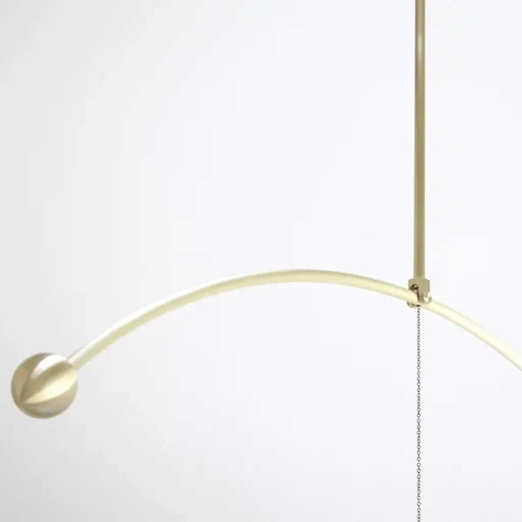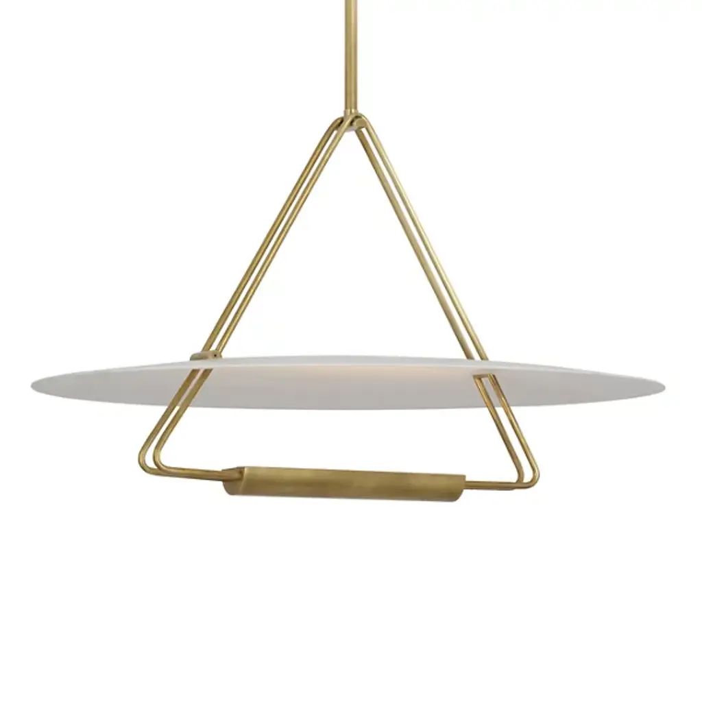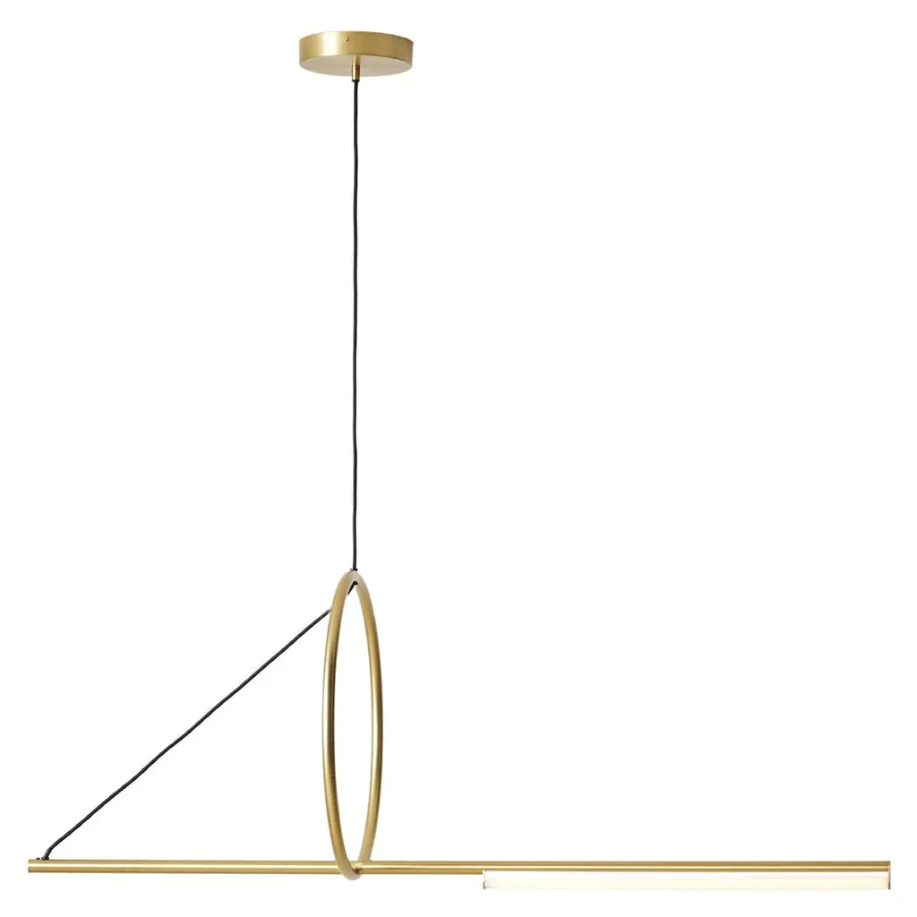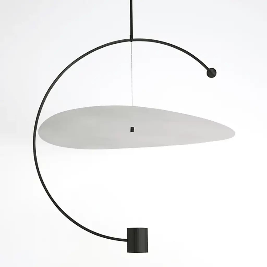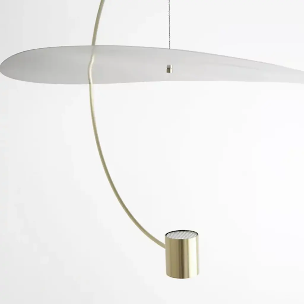 Both a practical light and an airy illuminated sculpture, the Float Round LED Pendant from Ladies and Gentlemen Studio refines and defines its space with eloquent ease. Suspended from a subdued canopy, its design focuses on a single moment of suspension, using a long, slender downrod to support a curving armature that terminates in a two-sided LED lamp set inside a cylinder housing. The uplight reflects off and is diffused by a disc of glass, accompanying the direct spot of downlight that sweeps out below.