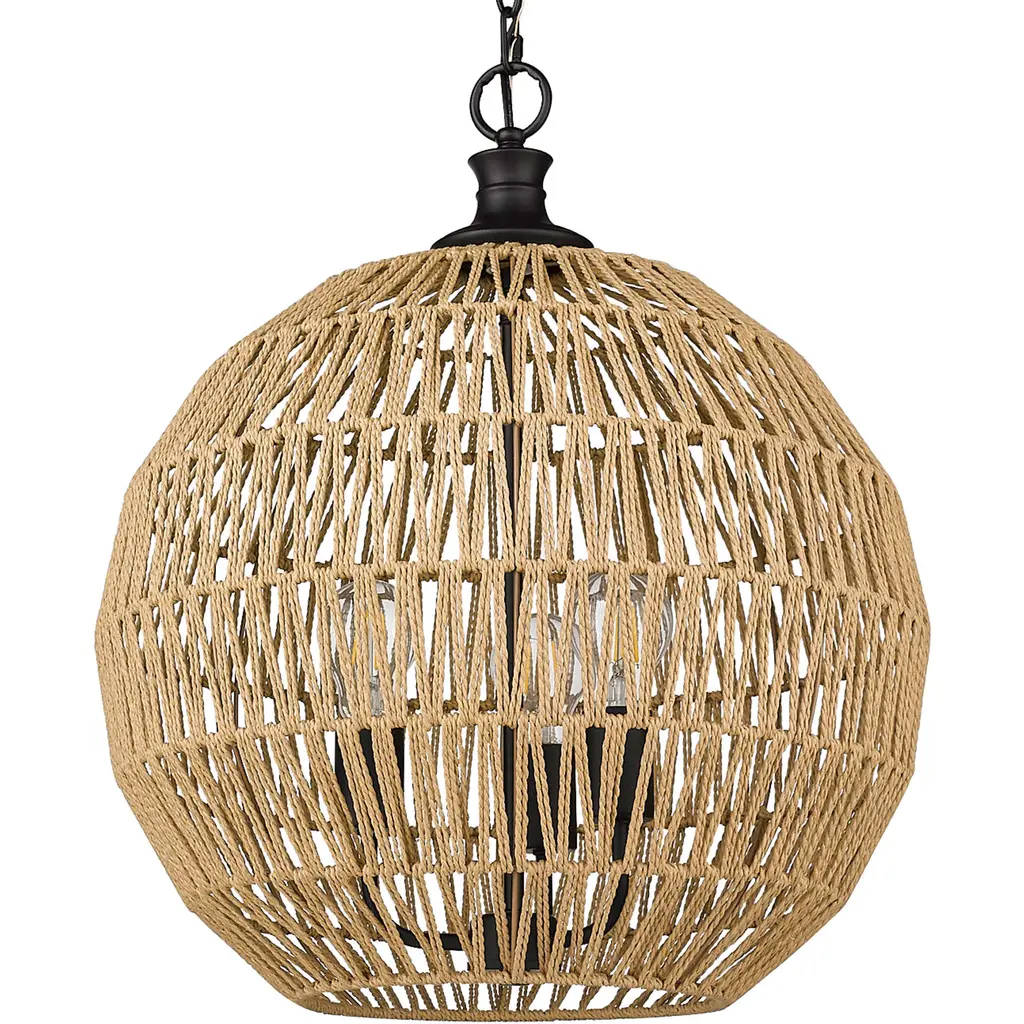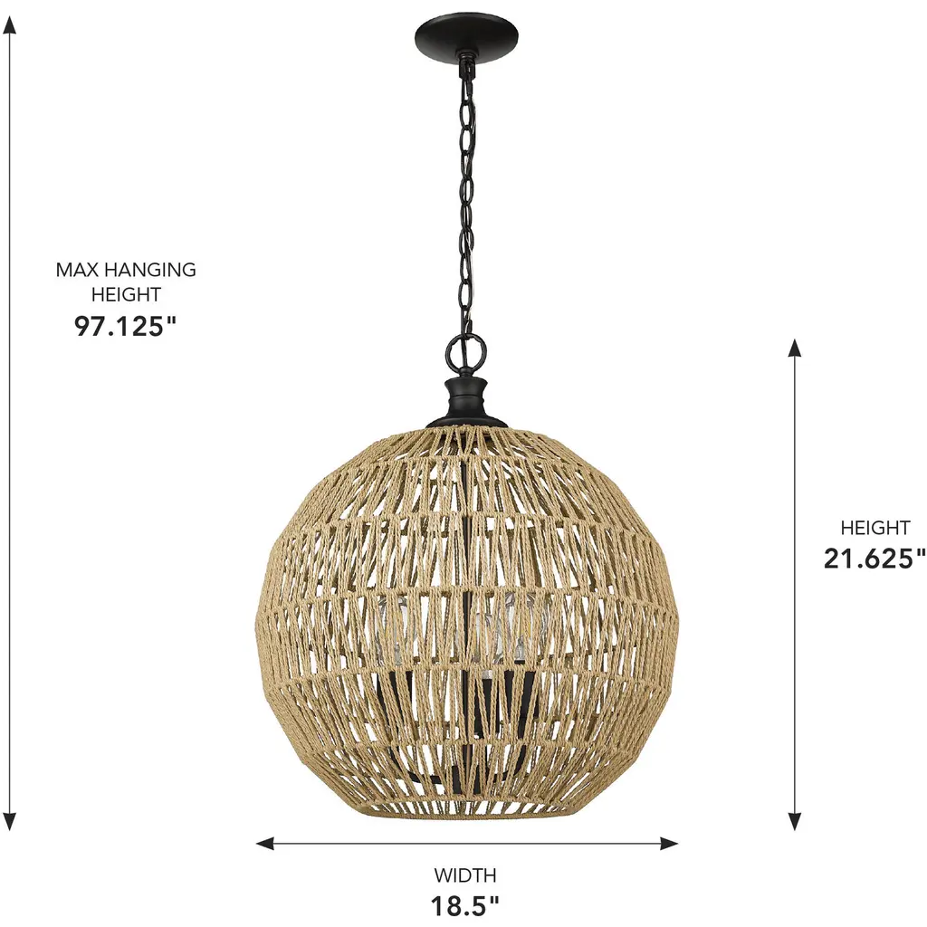 Bring Boho elegance into your home with the Golden Lighting Florence 3-light Pendant in Matte Black. Featuring a rope shade and a matte black frame, it creates a welcoming atmosphere. The natural raphia rope shade brings a breezy, coastal feel to any space, with its hand-woven construction and interplay of light and shadow. The finish is the epitome of clean, modern style, its deep, uniform black color adds sophistication and versatility, complementing various décor. Ideal for dry locations, this pendant is perfect for indoor spaces like bedrooms and living rooms. It's sloped-ceiling compatible, with an adjustable height of 25.125" to 97.125". Overall dimensions are 18.5"W x 21.63"H x 18.5"D, and it requires 3 E26 medium base bulbs (not included) with a maximum wattage of 60 per bulb. Elevate your home's aesthetic with this versatile and stylish lighting fixture.