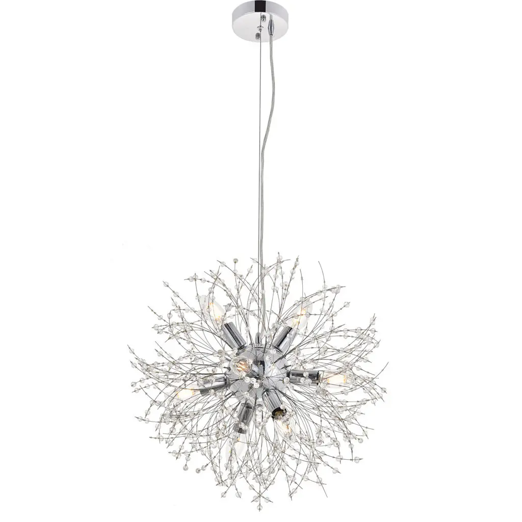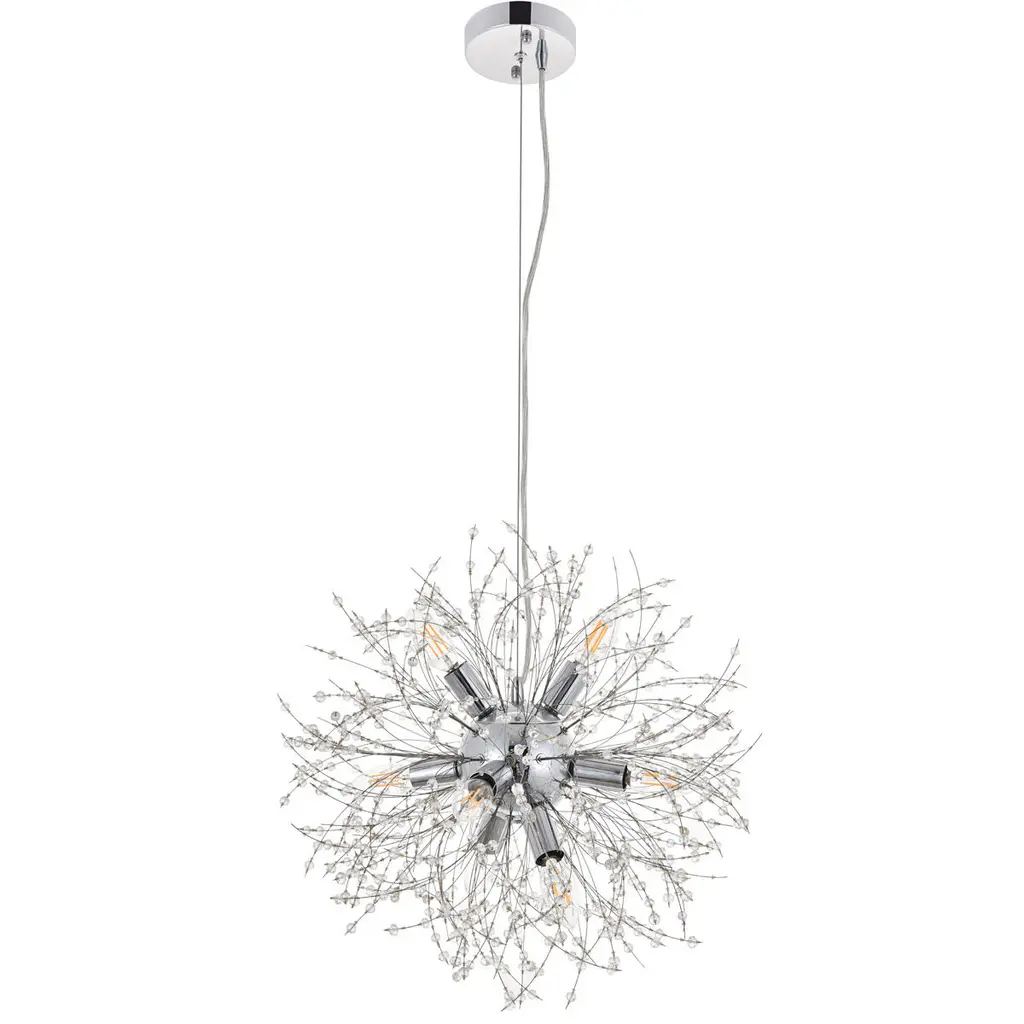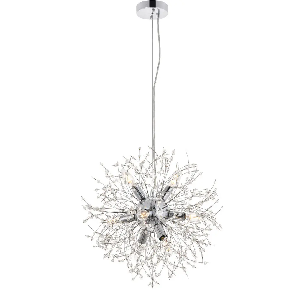 As if in a dream, this Flores collection pendant lamp in a chrome finish will guide you to where you need to go. Despite being reminiscent of a beautiful bouquet of flowers in the dreamlike springtime world, this light is perfect year-round. With 8 lights playing hide-and-seek within the strands of crystals, this pendant is the perfect cheerful addition to any home.