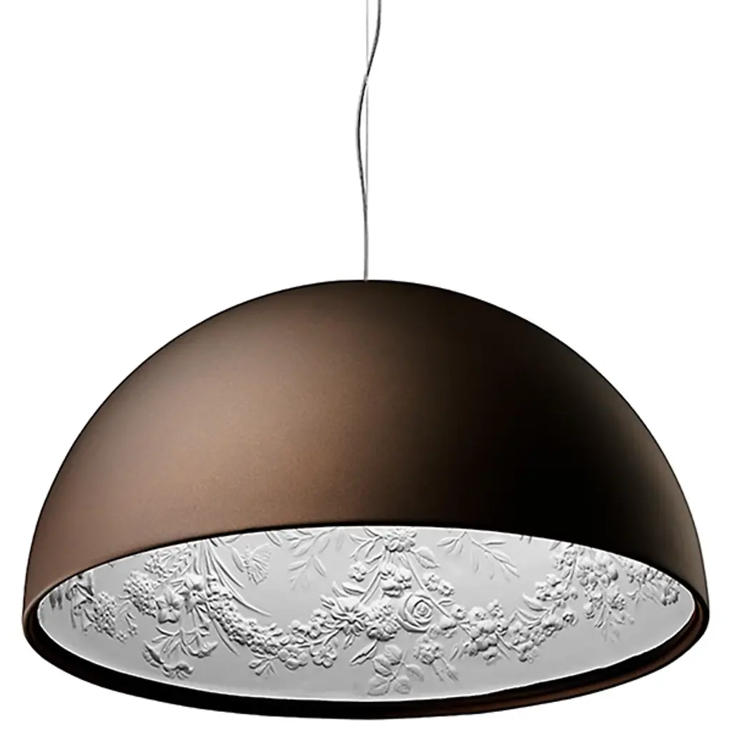 Flos Small Skygarden Pendant Dimmable Light in Brown by Marcel WandersImagine a stunning display blooming above you: Created by Marcel Wanders, the Skygarden S is just that. A gracefully hanging hemisphere, the pendant lamp makes a powerful impression with its sheer size. However, it is the inner diffuser in white painted cast plaster that steals the show. Standing beneath it, you will see the intricate design that gives this piece its name.The Skygarden’s plaster diffuser support is die-cast aluminum alloy. Its upper cable gland and blocking ring nut come in black injection-molded PC (polycarbonate). Shaped adjustment screws are included.The upper and lower silicone shock absorbers are injection-molded and transparent. The lamp-holder and fixing support come in PPS. The diffuser is flashed and blown opal glass. The molded fixing ring nut is die-cast aluminum alloy with alodine plating. The frieze is photo-etched and mechanically drawn AISI 304 steel. The ceiling attachment is molded and galvanized steel ceiling attachment. It has a gray, injection-molded PA6 (Nylon) rose, steel wire, and a FEP/SIL UV-stabilized transparent power cord.Inspiration behind the design: A house Marcel Wanders once lived in, which featured an old and ornate plaster ceiling that he dubbed his “Skygarden,” inspired this artistic piece. Wishing that he could take this “garden on the ceiling” with him when he moved, Wanders created this pendant lamp so that he could do just that—and then share it with the world.Additional Information:Material: Plaster, Glass, Stainess steelFinish: BrownModel: Small - 15.7'' DiameterMounting: Ceiling PendantLamp ID: L00068 L00010Environment: Indoor - Dry LocationLamp (Bulb) Description: LED 9.5W E12 2700K CRI90 950lmDimmable: Phase-cut Dimming / Triac Type (not included)Voltage: 120IP Rating: IP20Cord Length: 106 inch ClearDimensions: Ø 15.7 x 7.8 H inchAvailable in other finish options: Black, Gold, Matte Black, WhiteAvailable in other model options: S1 - 23.6" Diameter, S2 - 35.4" Diameter