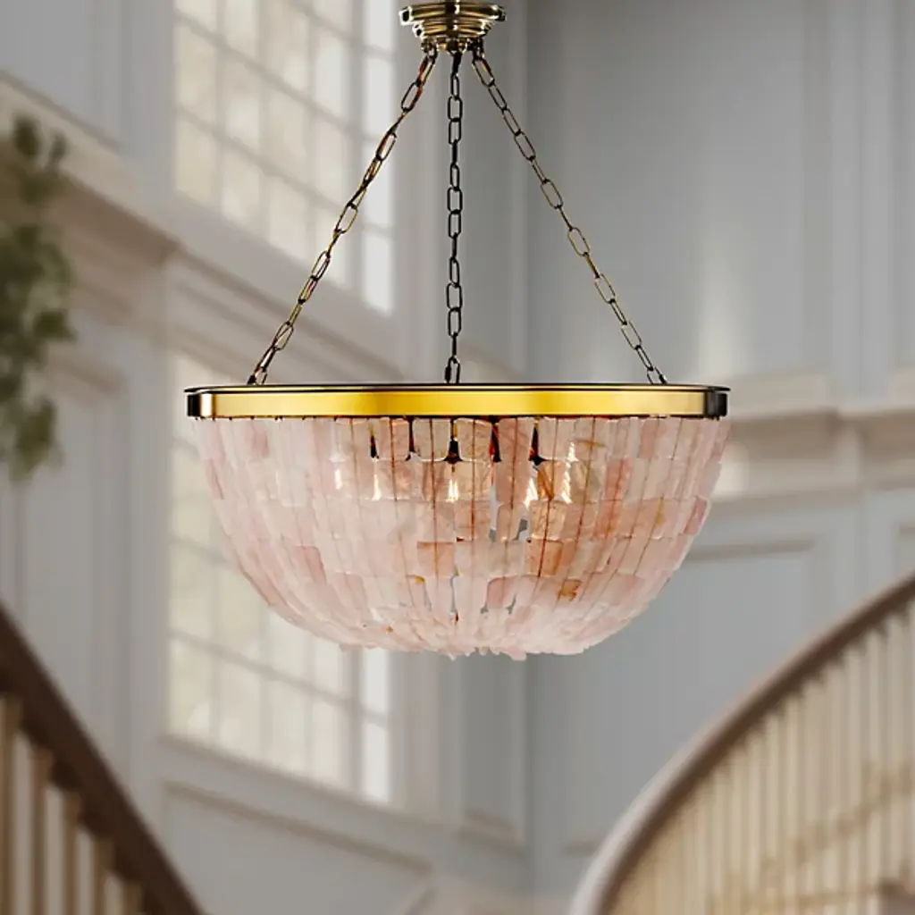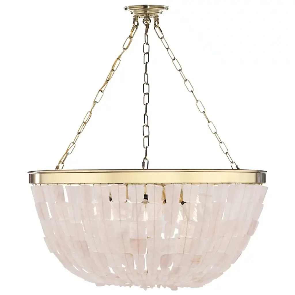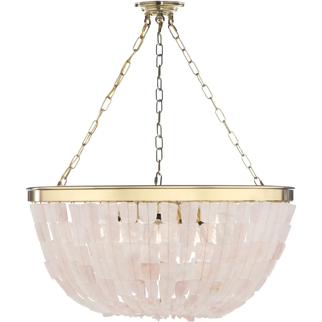The Flotsam Pendant from Metro Lighting layers river agate pieces into a bowl-shaped collection of natural stone. Each unique gemstone fragment contains its own patterns and striations accumulated through geological processes. The metal framework and chain support keep a nominal presence, allowing the stones to define the form. Light penetrates between the organic shapes, highlighting their natural variations. This pendant celebrates the random beauty of water-worn stones gathered into an organized composition.