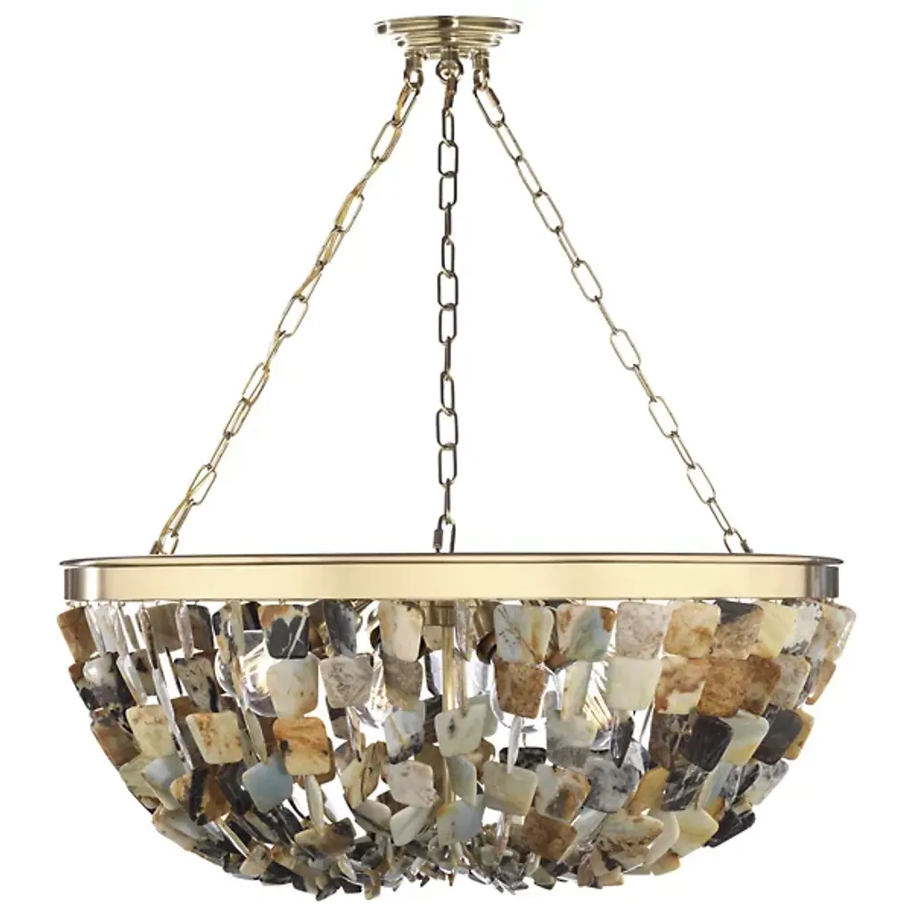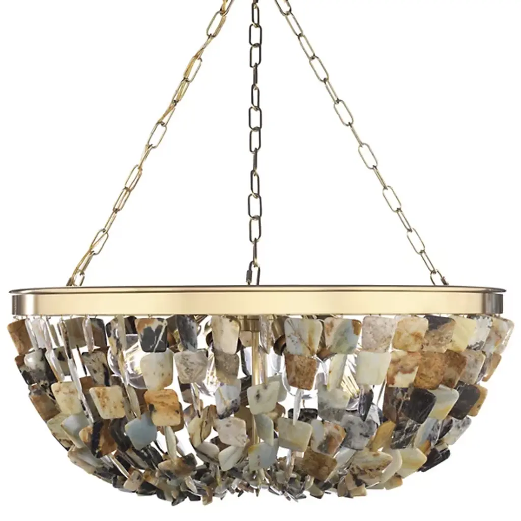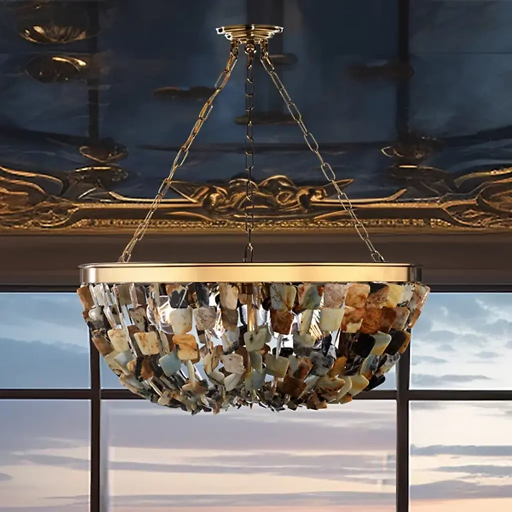 The Flotsam Pendant from Metro Lighting layers river agate pieces into a bowl-shaped collection of natural stone. Each unique gemstone fragment contains its own patterns and striations accumulated through geological processes. The metal framework and chain support keep a nominal presence, allowing the stones to define the form. Light penetrates between the organic shapes, highlighting their natural variations. This pendant celebrates the random beauty of water-worn stones gathered into an organized composition.