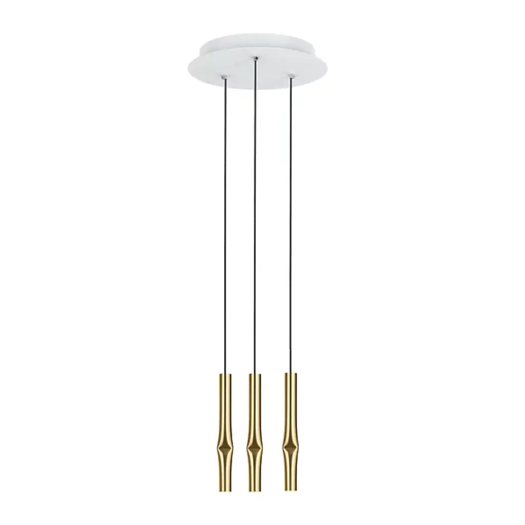 The Flow LED Pendant from Estiluz was designed by Estudi Ribaudi. This pendant exudes contemporary style, creating a sophisticated lighting solution for your space. The cylindrical encasements, suspended in midair from a ceiling canopy, define its streamlined aesthetic. The metal frameworks feature elegant diamond-shaped silhouettes at their center, adding a touch of refinement. Illuminated by an integrated LED, Flow brings brilliant light from above that is dimmable using a separately sold ELV dimmer.