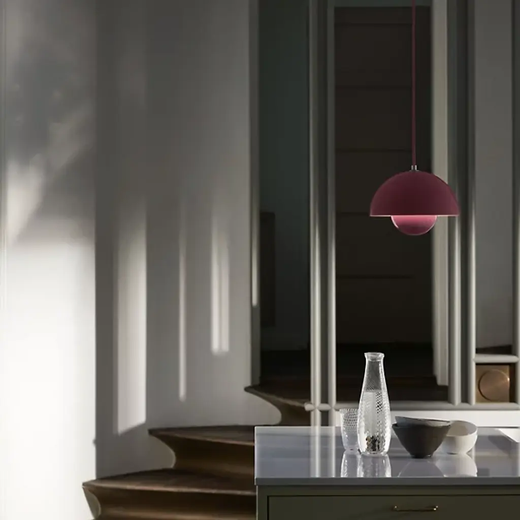 The Flowerpot VP1 Pendant from &Tradition is designed by Verner Panton, blending timeless elegance with contemporary flair. Crafted with care, this pendant features a dome-shaped shade made of high-quality metal. It’s secured by a downrod and ceiling canopy. The 2-hemisphere formation adds functionality and contemporary flair. Made in the Scandinavian artisanal tradition, Flowerpot showcases impeccable craftsmanship and a commitment to quality. For versatility, this fixture is dimmable with a separately sold ELV dimmer.