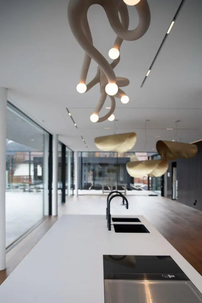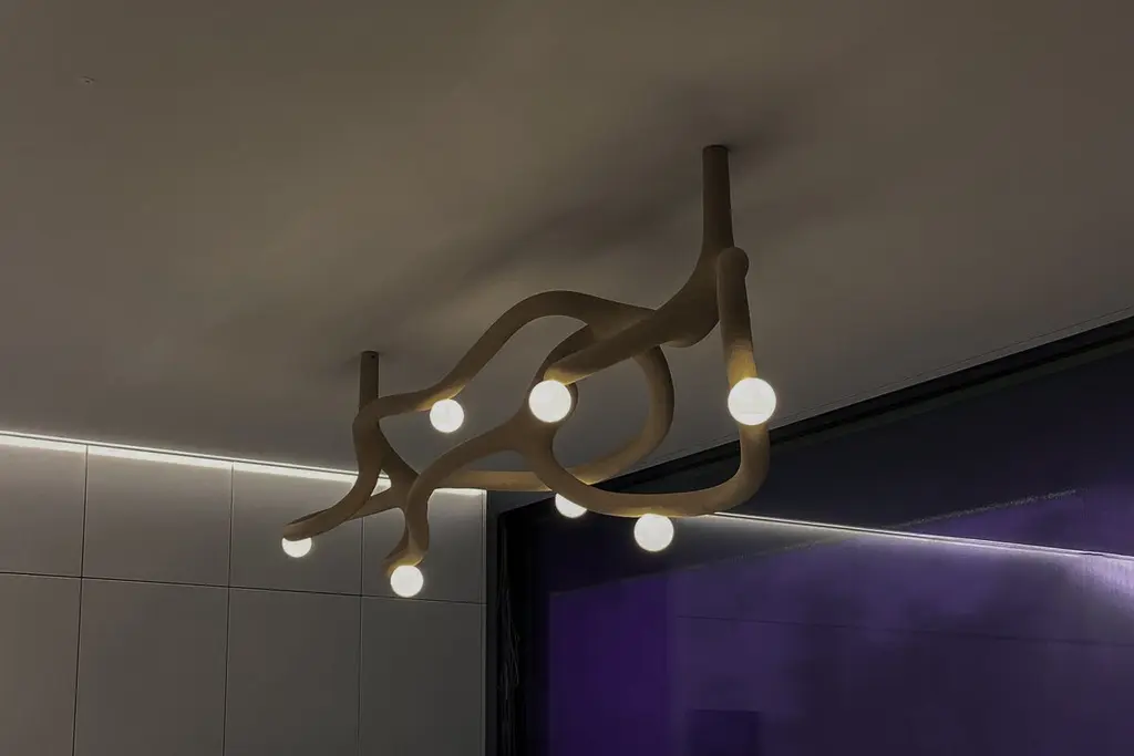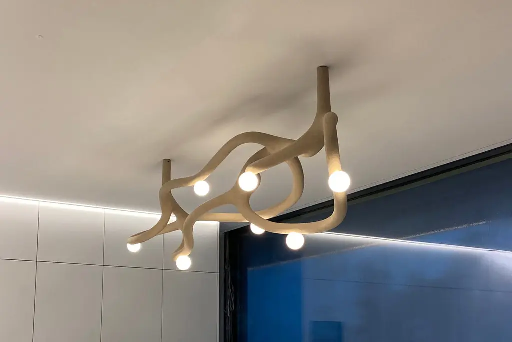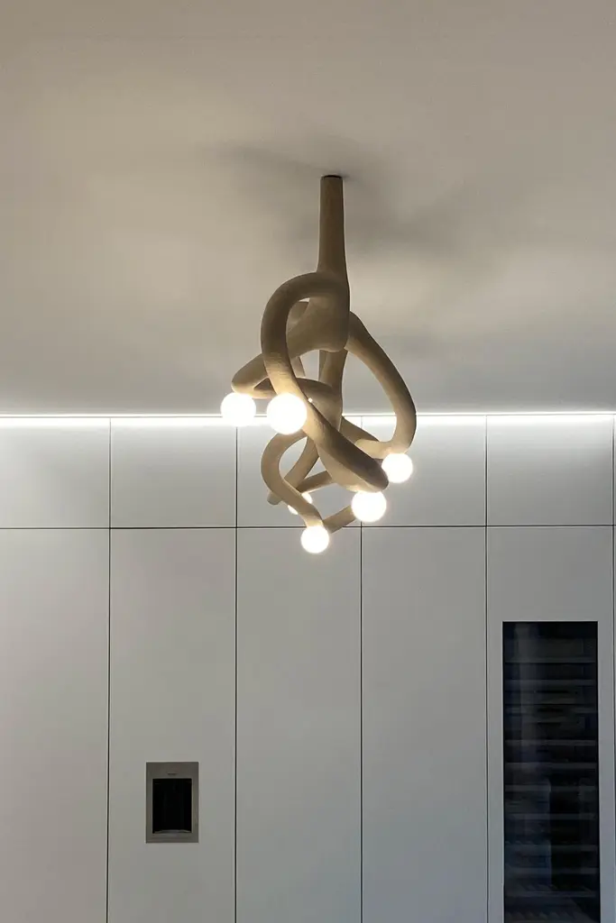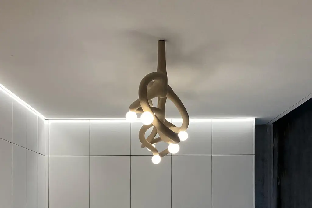 Fluid Limited Edition Blown Glass and Nylon Pendant Lamp by Hot Wire ExtensionsLimited Edition of 5Dimensions: D 51 x W 250 x H 82 cm Materials: Waste nylon powder, locally sourced beige sand, copper pipe, hand-blown glass bulbs.40 kgDifferent dimensions, shapes, and colors upon request.All our lamps can be wired according to each country. If sold to the USA it will be wired for the USA for instance.Hot Wire Extensions is a young sustainable design brand, presenting a bold innovative manufacturing process.Exploration is central to our philosophy and the Hot Wire Extensions process is conceived with this in mind. Using waste SLS 3D nylon powder, a material that is currently not recycled, and inspired by the way a vine grows around a tree, we reuse the material to create organic bone-like structures built around a wire.We design and develop a diverse range of products, furniture and installations as well as bespoke commissions all characterised by our dedication to the mindful exploration of new material landscapes.