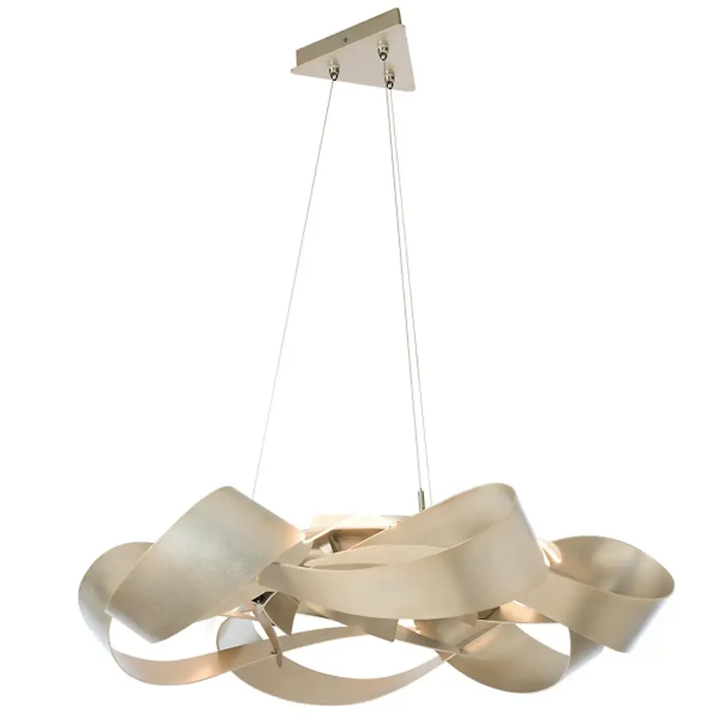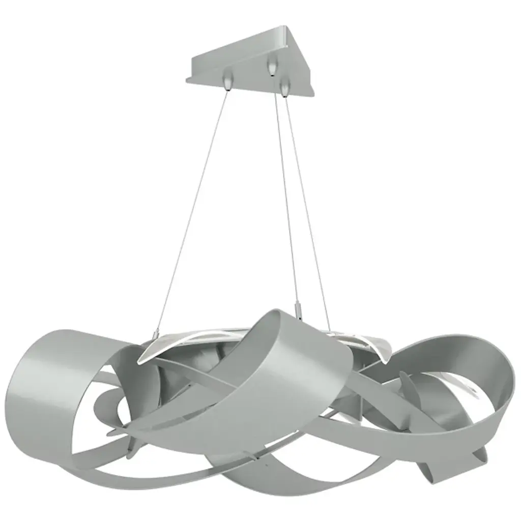 Intertwining polished aluminum hangs from thin cables, creating a very unique and sculptural pendant. The Hubbardton Forge Flux Large LED Pendant features acrylic light guide plates, better distributing the LED light source. The illumination from the LED is injected into the sides of the light guide plate, creating a more even light source. Edge lighting technology has been used in commercial settings before, but not until recently was it possible for it to be used in residential applications.