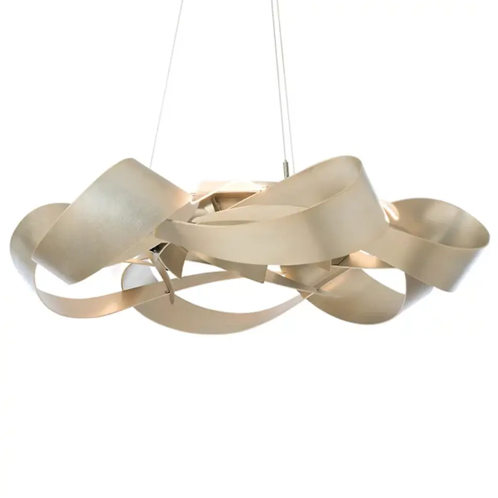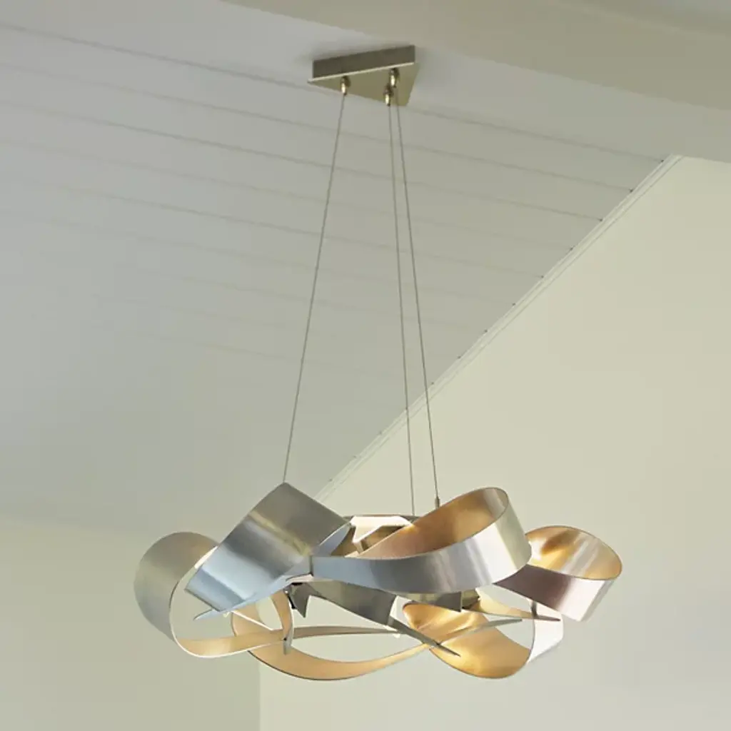 Intertwining polished aluminum hangs from thin cables, creating a very unique and sculptural pendant. The Hubbardton Forge Flux Large LED Pendant features acrylic light guide plates, better distributing the LED light source. The illumination from the LED is injected into the sides of the light guide plate, creating a more even light source. Edge lighting technology has been used in commercial settings before, but not until recently was it possible for it to be used in residential applications.