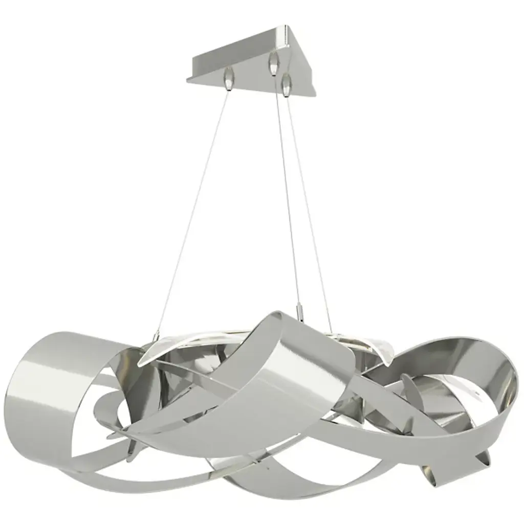 Intertwining polished aluminum hangs from thin cables, creating a very unique and sculptural pendant. The Hubbardton Forge Flux Large LED Pendant features acrylic light guide plates, better distributing the LED light source. The illumination from the LED is injected into the sides of the light guide plate, creating a more even light source. Edge lighting technology has been used in commercial settings before, but not until recently was it possible for it to be used in residential applications.