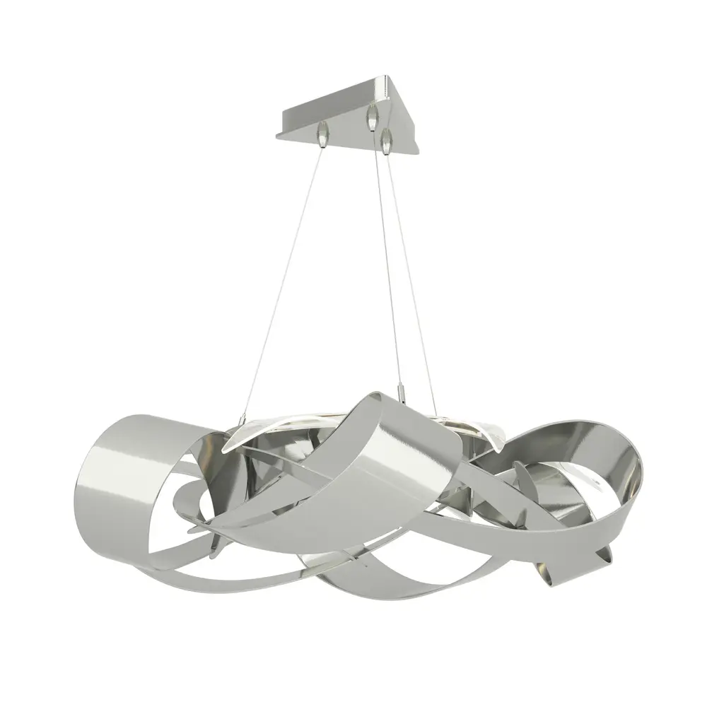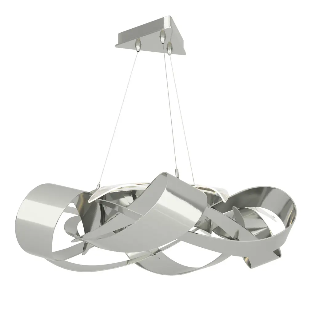 Our large-scale Flux utilizes six separate edge-lit LED light guides to elegantly illuminate the hand-curved aluminum ribbons that intertwine below. Its gentle curves create the illusion of movement.