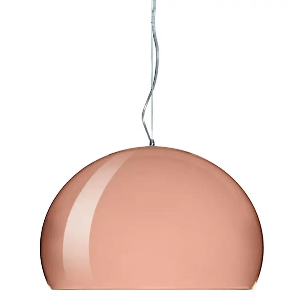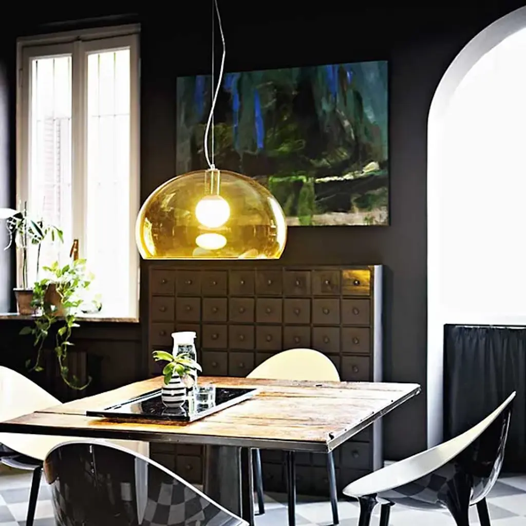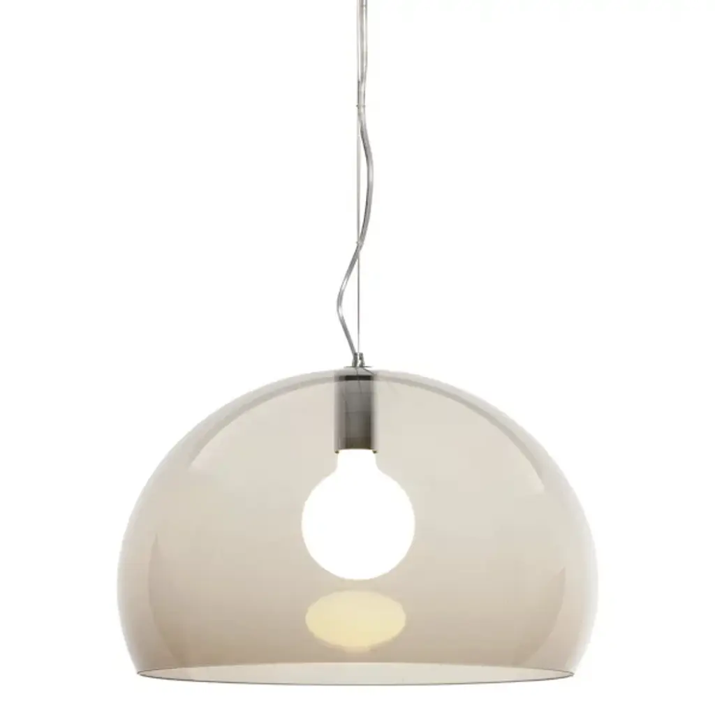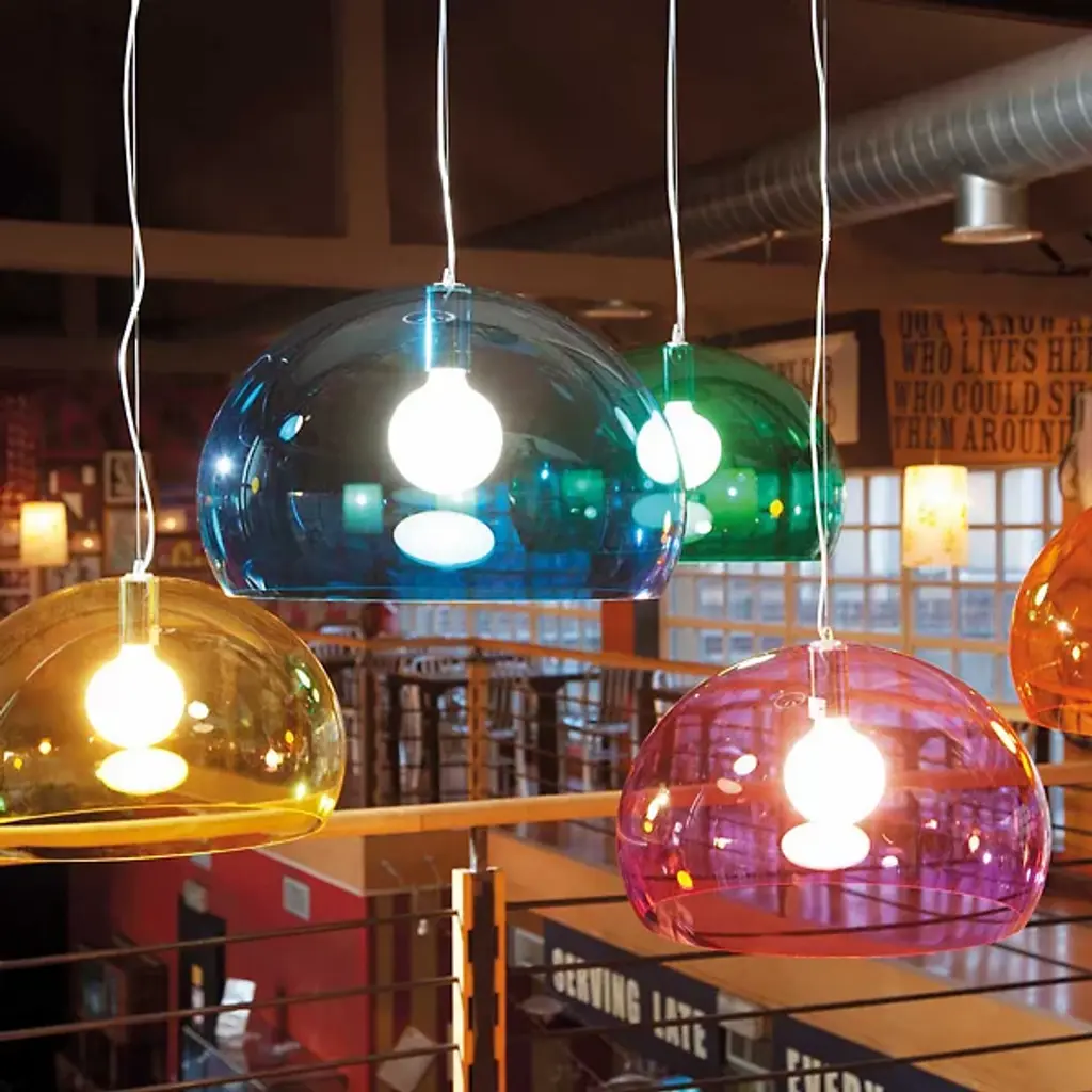 Originally designed in 2002 by Ferruccio Laviani, the Kartell FL/Y Pendant Light features a collection of dome shades available in a vibrant range of colors. The gradual concave curve at the base is the defining characteristic of the design, actualizing the dual use of ambient and functional down lighting. The batch-dyed thermoplastic shade is crisp in transparent finishes, bringing to mind the lightness and iridescence of a soap bubble in bright light.