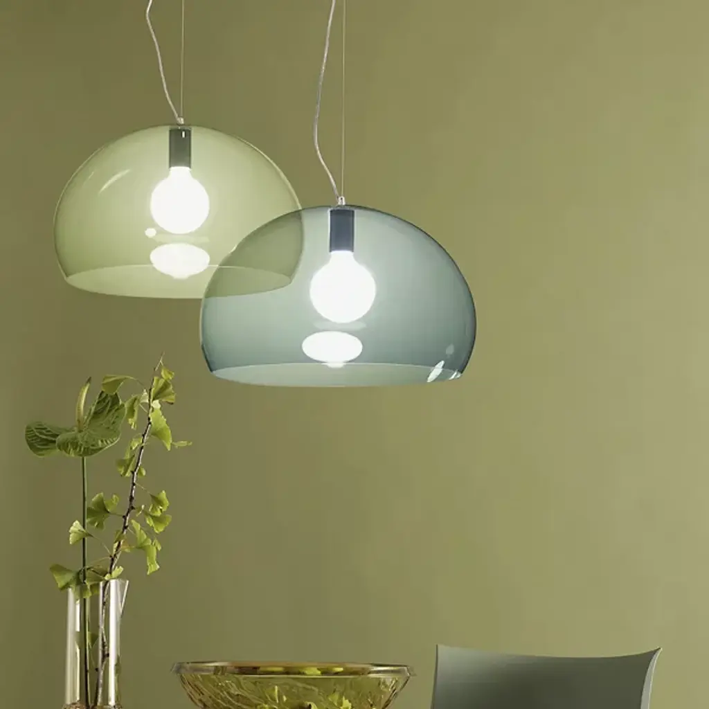 Originally designed in 2002 by Ferruccio Laviani, the Kartell FL/Y Pendant Light features a collection of dome shades available in a vibrant range of colors. The gradual concave curve at the base is the defining characteristic of the design, actualizing the dual use of ambient and functional down lighting. The batch-dyed thermoplastic shade is crisp in transparent finishes, bringing to mind the lightness and iridescence of a soap bubble in bright light.