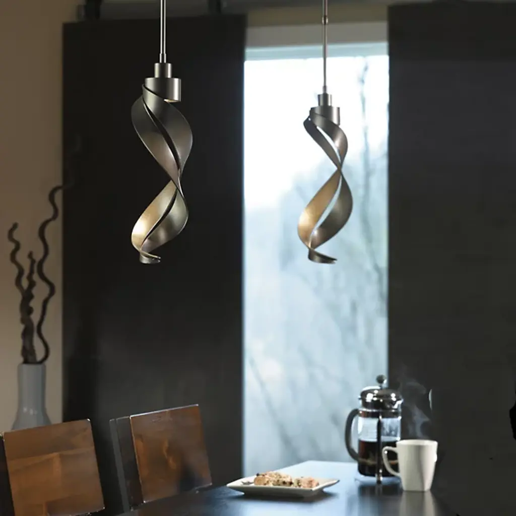 A simple swirling silhouette lends effortless elegance to the Hubbardton Forge Folio Mini Pendant. Hand-forged wrought iron is fashioned into a loose spiral that draws the eyes upwards as it ascends to the adjustable suspension stem. Light from the small, tiered support cascades down the inner curves of the ironwork, highlighting its unique texture. Hang several to create a sense of relaxed motion over countertops or bars.