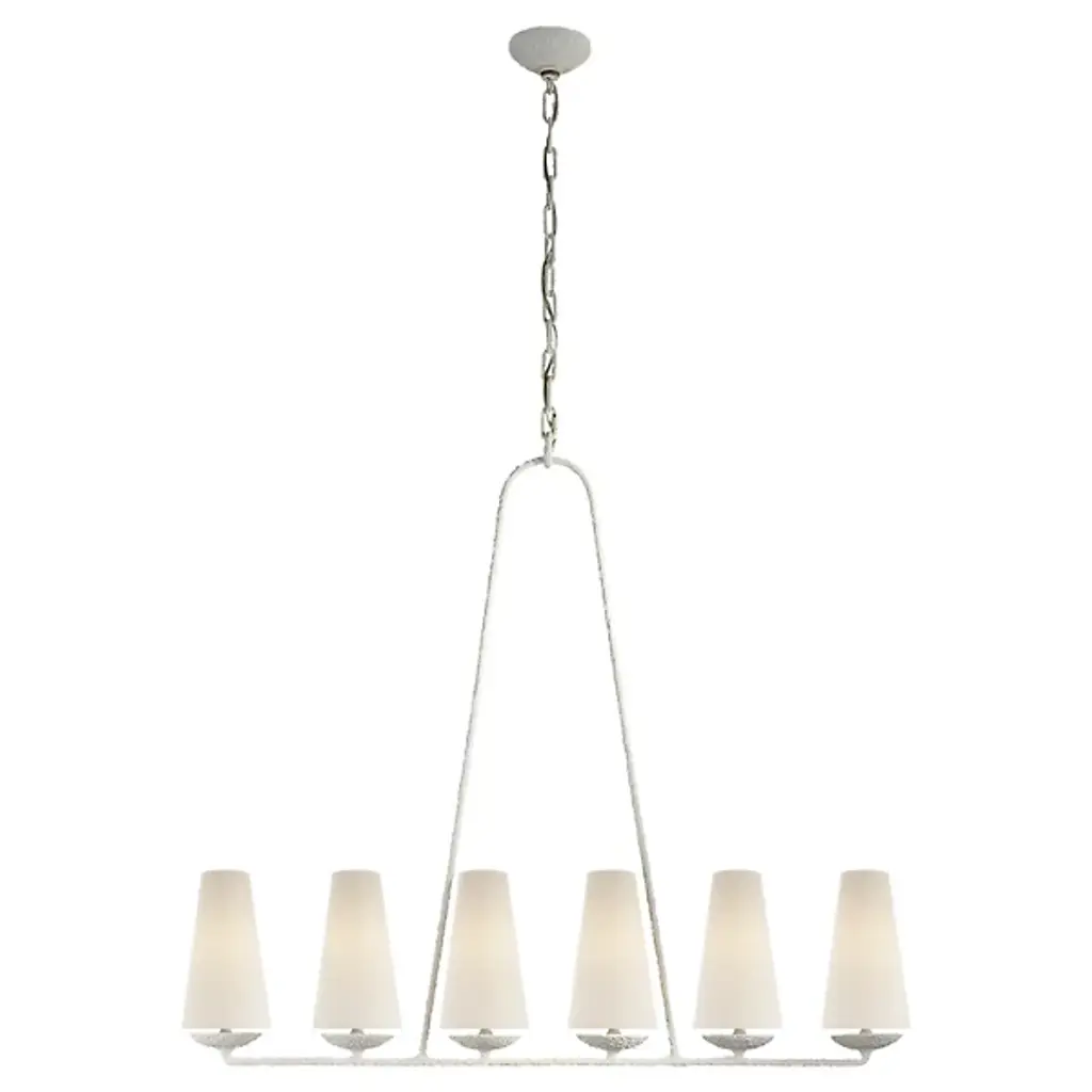 This linear fixture suspends from a curved, aged iron rod and is topped with six linen shades for a touch of modern elegance. Hardwired.