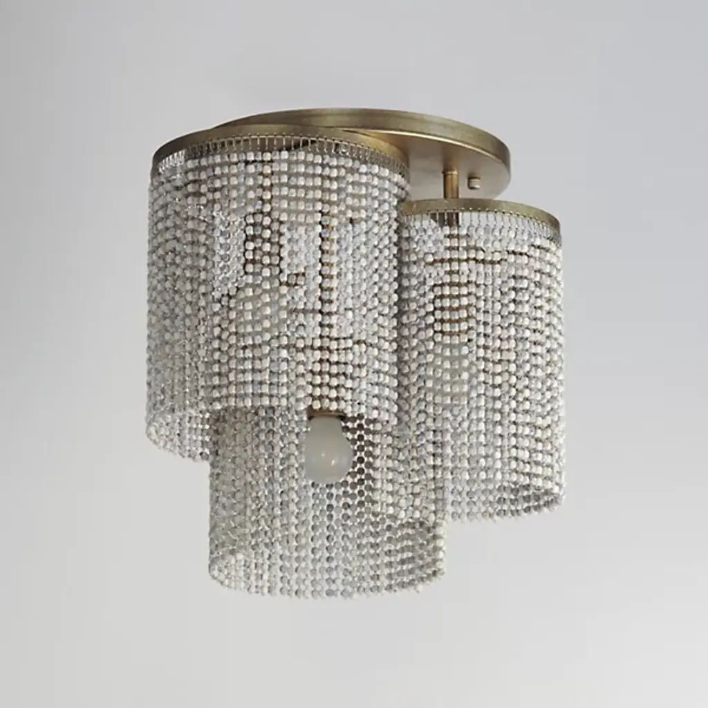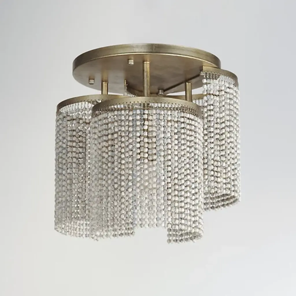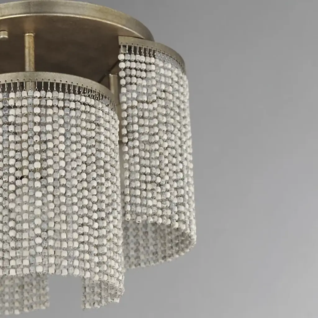 Radiating elegance and meticulous craftsmanship, the Fontaine Semi-Flushmount from Maxim Lighting epitomizes sophistication and artistry. Its design exudes opulence, featuring cascading strands of square Weathered Wood beads suspended on an offset spiraling frame, finished in luxurious hand-applied Golden Silver leaf. The gentle illumination from within enhances any space's ambiance, accentuating its charm. Versatile and sophisticated, this pendant caters to diverse decor preferences, making it a captivating addition to various interior settings.