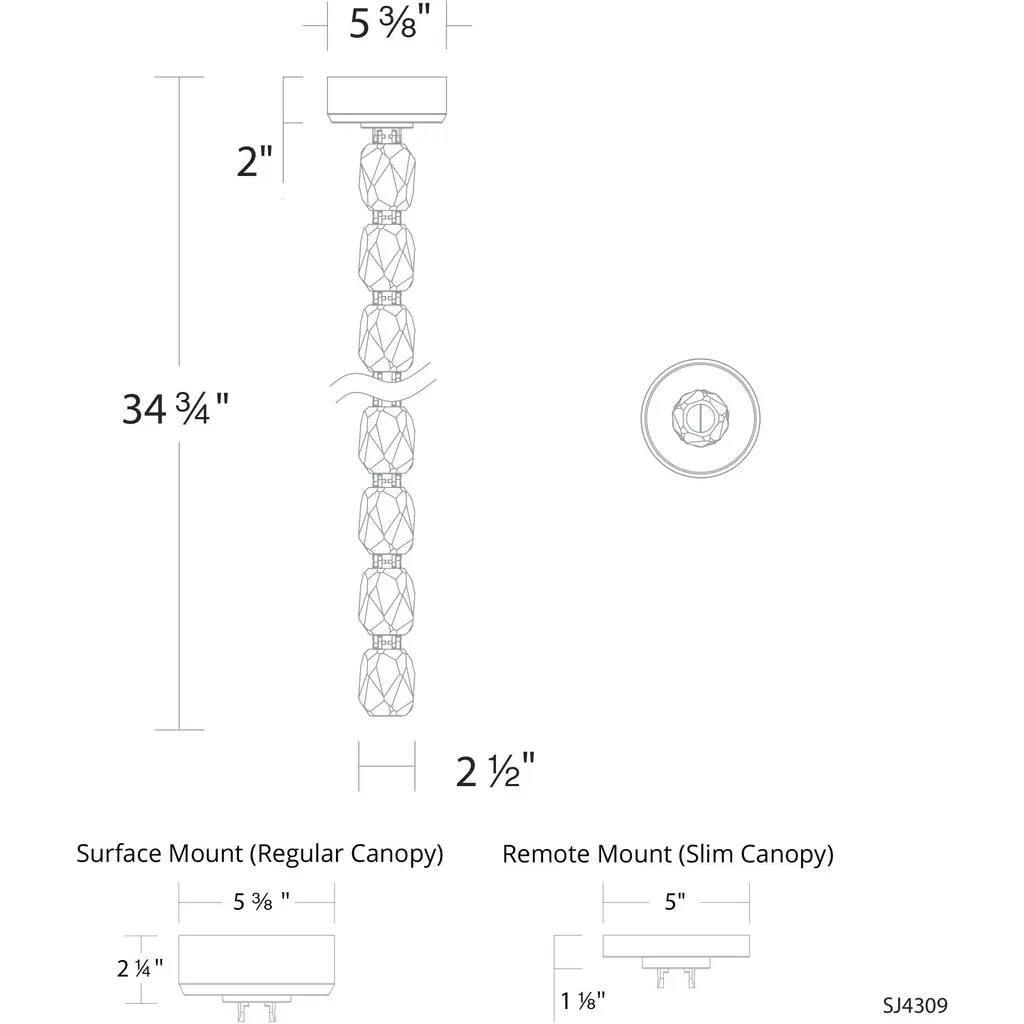 Bound to become a modern heirloom, this luxe pendant showcases a glittering chain of Radiance crystal dust beads, each bound by lustrous metallic cuffs. LED's cast a glittering glow of illumination, offering just the right touch of sparkle to accessorize luxury settings. Schonbek Forever LED luminaires feature a 3-CCT color temperature selectable switch that can be accessed at the time of installation to toggle between 3000K-3500K-4000K color temperatures. Seduction is a modular pendant system with electronics powered by WAC, enabling a max run length of 66 lights or 240in length. 6 Light, 9 Light, 12 Light, and 22 Light pendants hang straight down with optional second canopy sold separately. 28 Light, 33 Light, and 66 Light configurations include two canapies to swag into U-shape. Constructed of steel featuring Schonbek Radiance Crystal Dust with thousands of diamond machine-cut and polished crystals cemented on the inside of a faceted Radiance Crystal, offering a superb refraction of light. Available in two mounting options - slim canopy with remote driver (driver sold separately) for installation up to 100ft away or with a canopy that has driver included concealed on the inside for mounting to an electrical junction box.